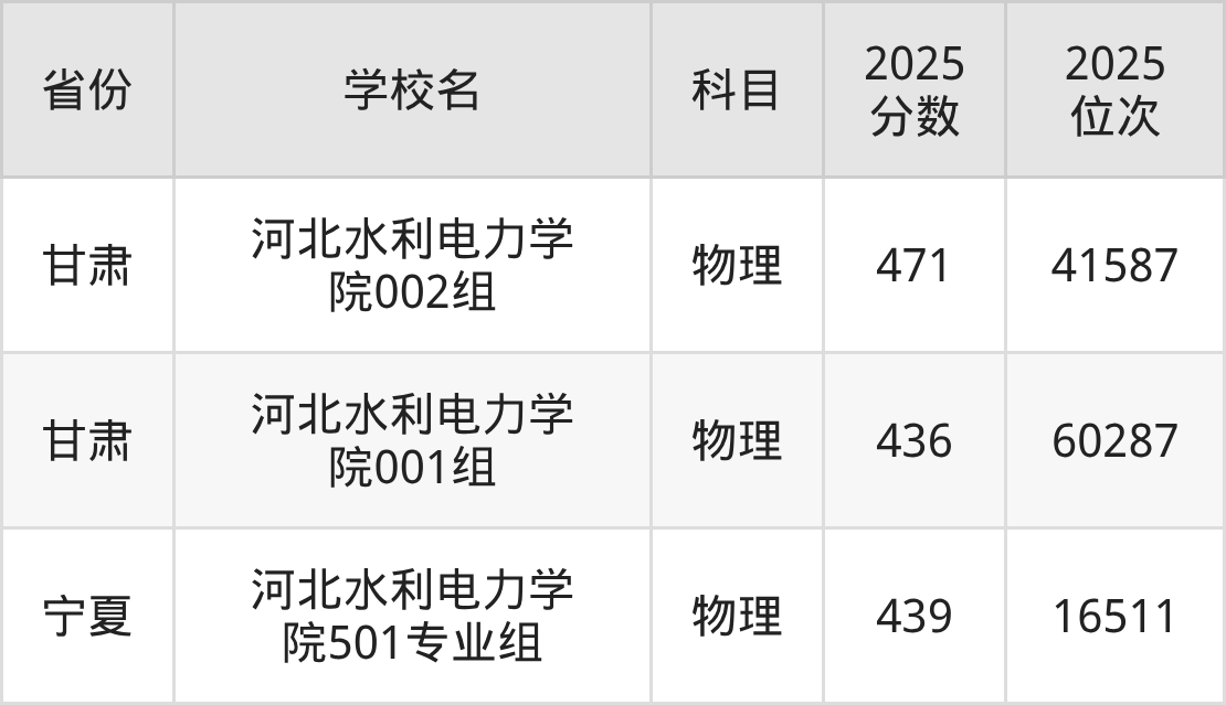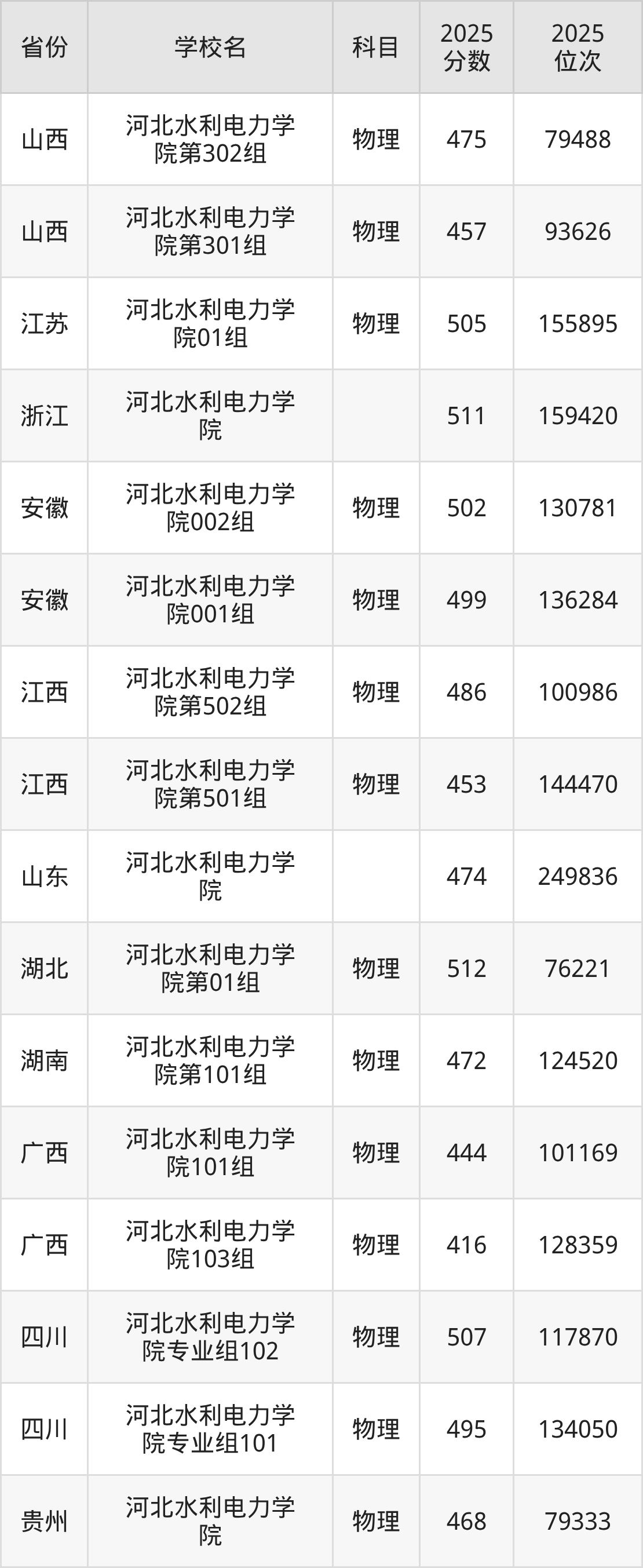 | 河北水利电力学 院 | 物理 | 500 | 160507 |