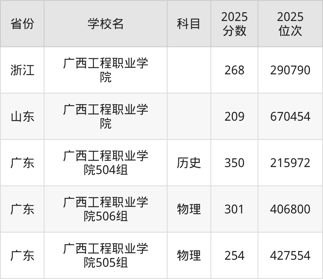 2026年广西工程职业学院录取分数线预计在250分及以上,在各省录取最低分存在一定差异,如:2025年广西工程职业学院在广东录取最低历史类350分、物理类254分,在广西录取最低历史类200分、物理类200分,在浙江录取最低分是268分。