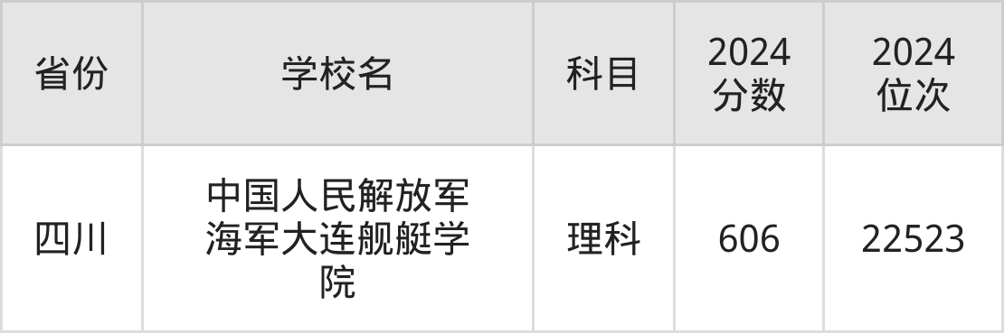 2024年中国人民解放军海军大连舰艇学院在省外录取分数线是606分,录取分数线最低在四川理科。