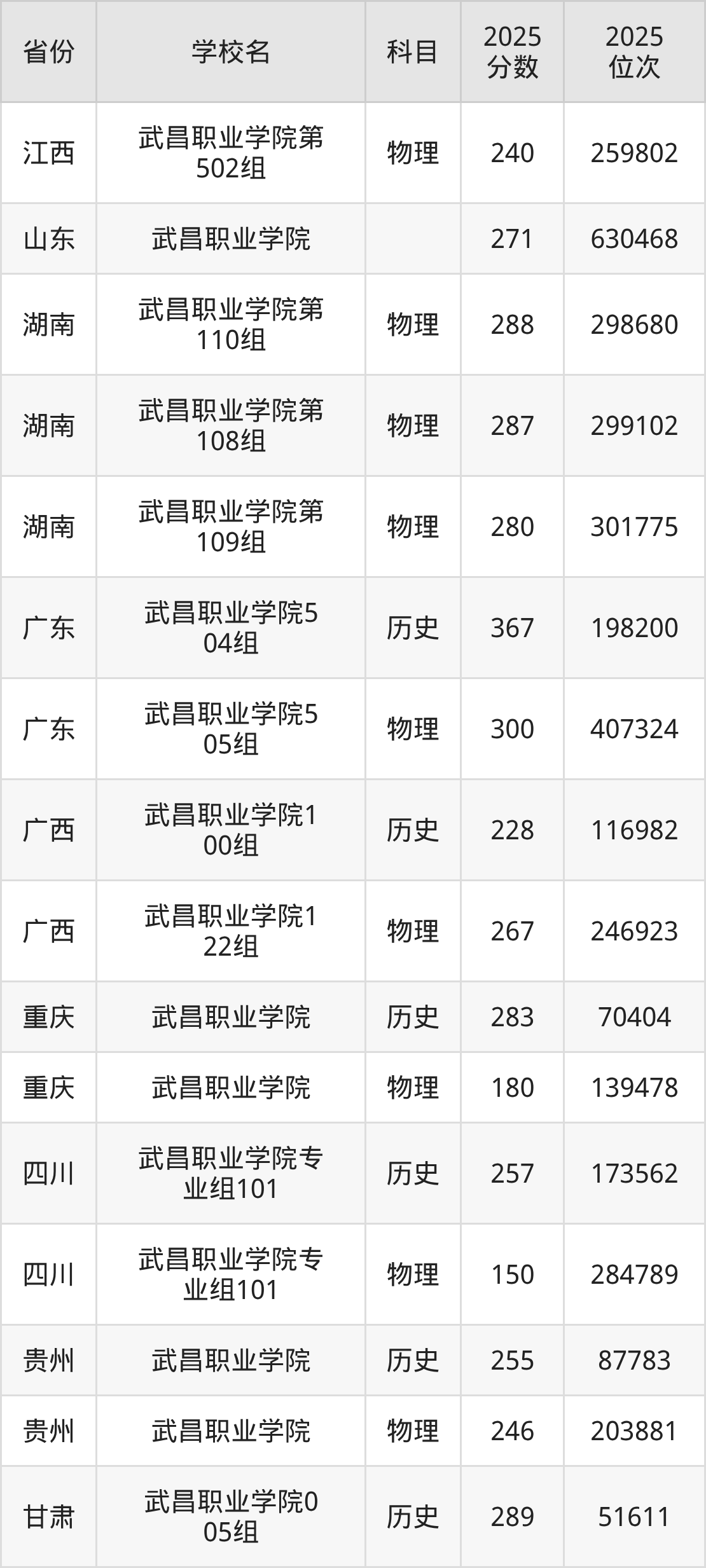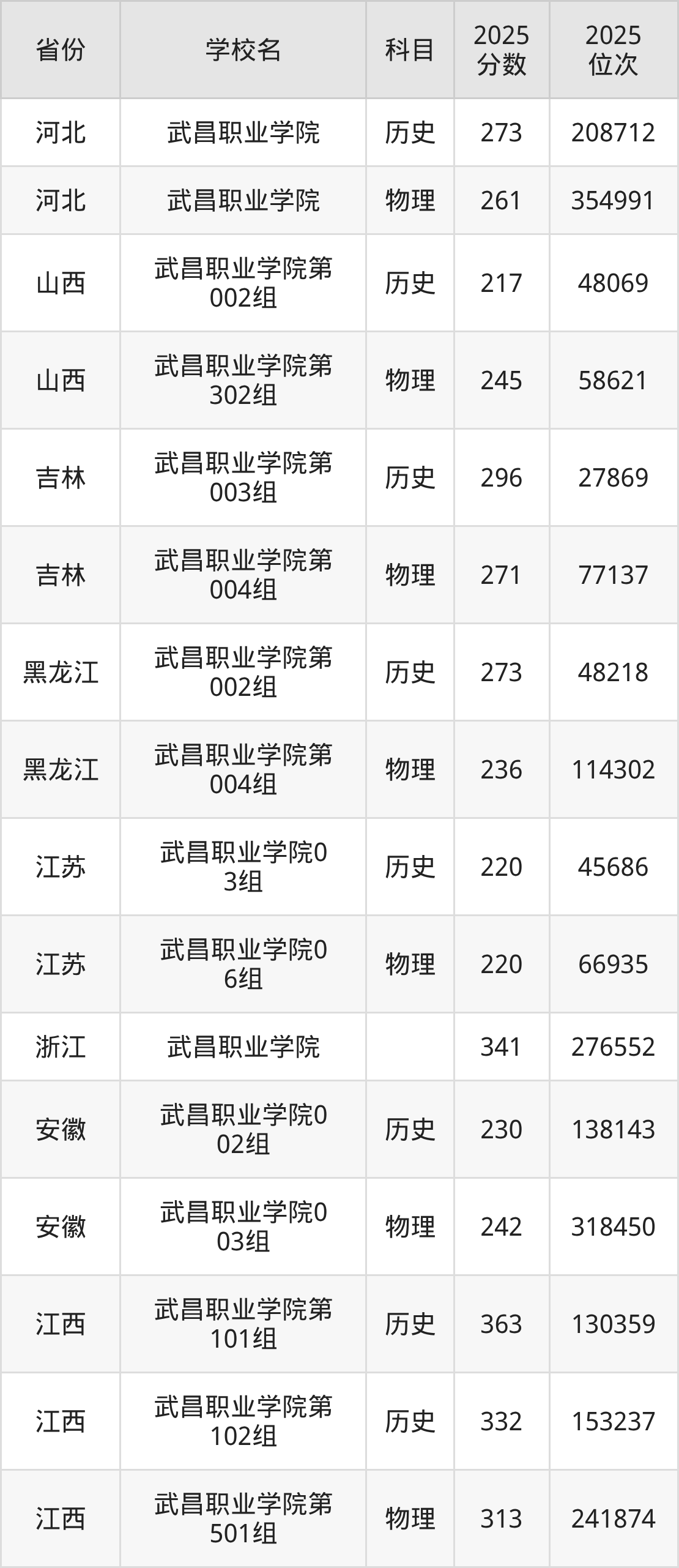 2025年武昌职业学院历史类最低分152分(138116名)、物理类最低分156分(247693名)。