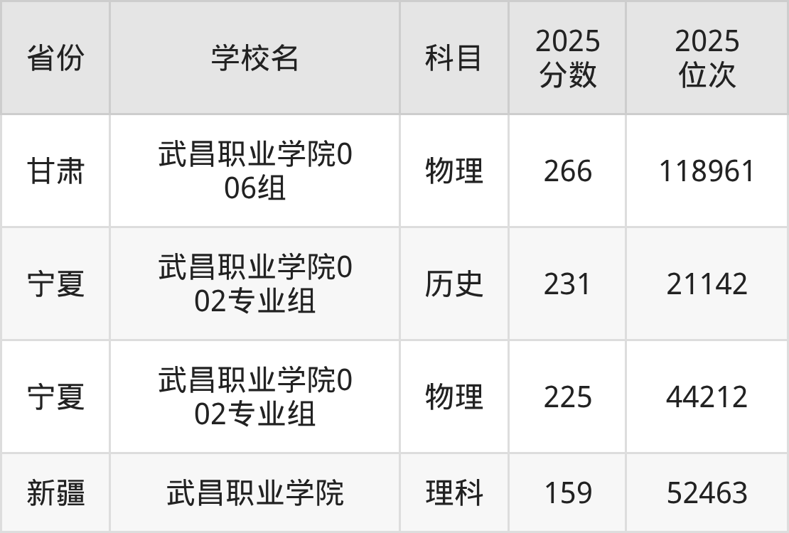 2025年武昌职业学院在省内分历史物理科目类录取,其中历史类最低分是152分、对应位次是138116名;物理类最低分是156分,对应位次是247693名。