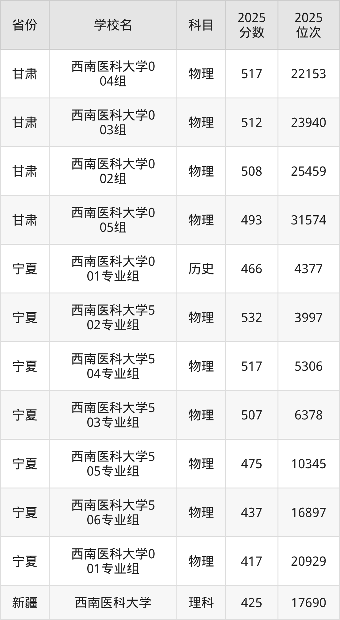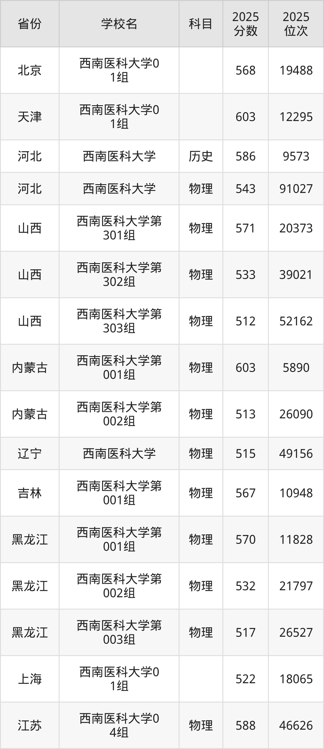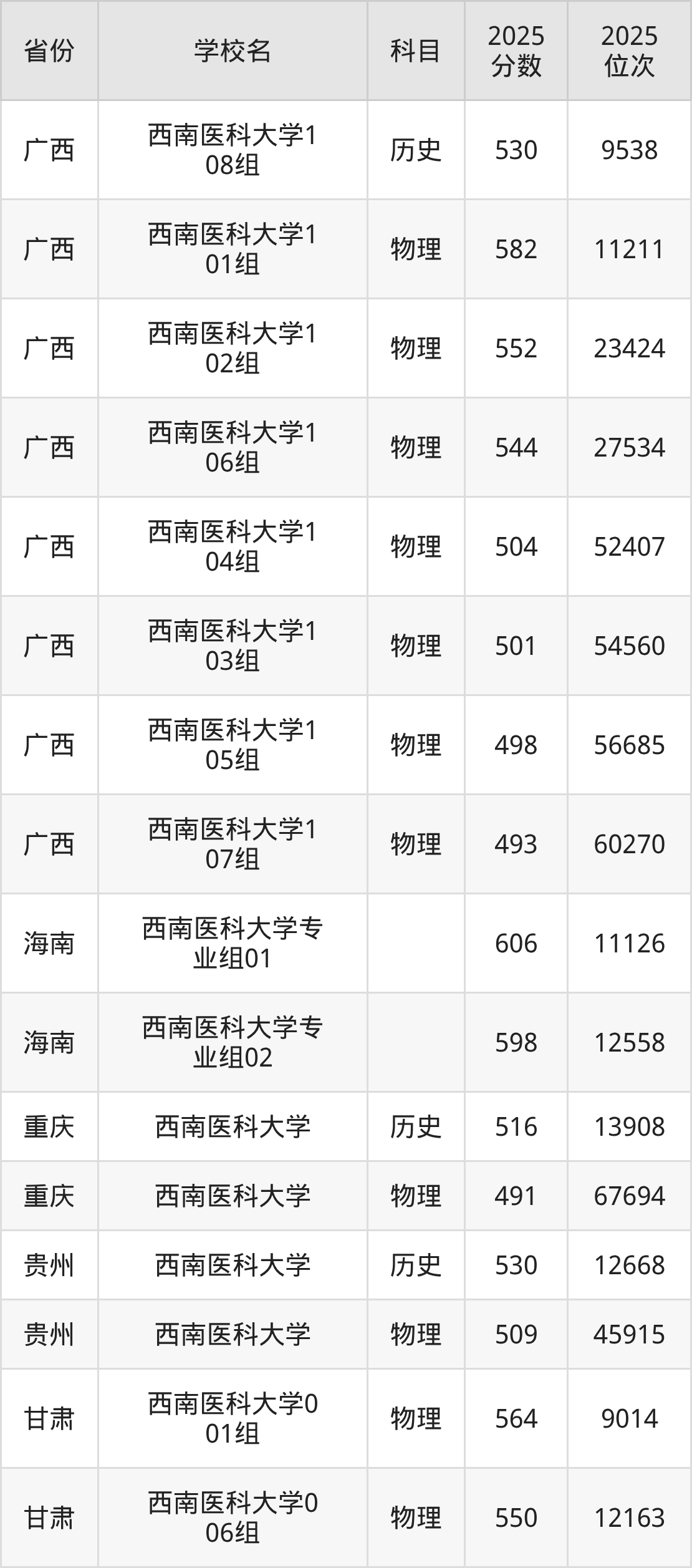 2025年西南医科大学在省内分历史物理科目类录取,其中历史类最低分是539分、对应位次是25206名;物理类最低分是469分,对应位次是169623名。