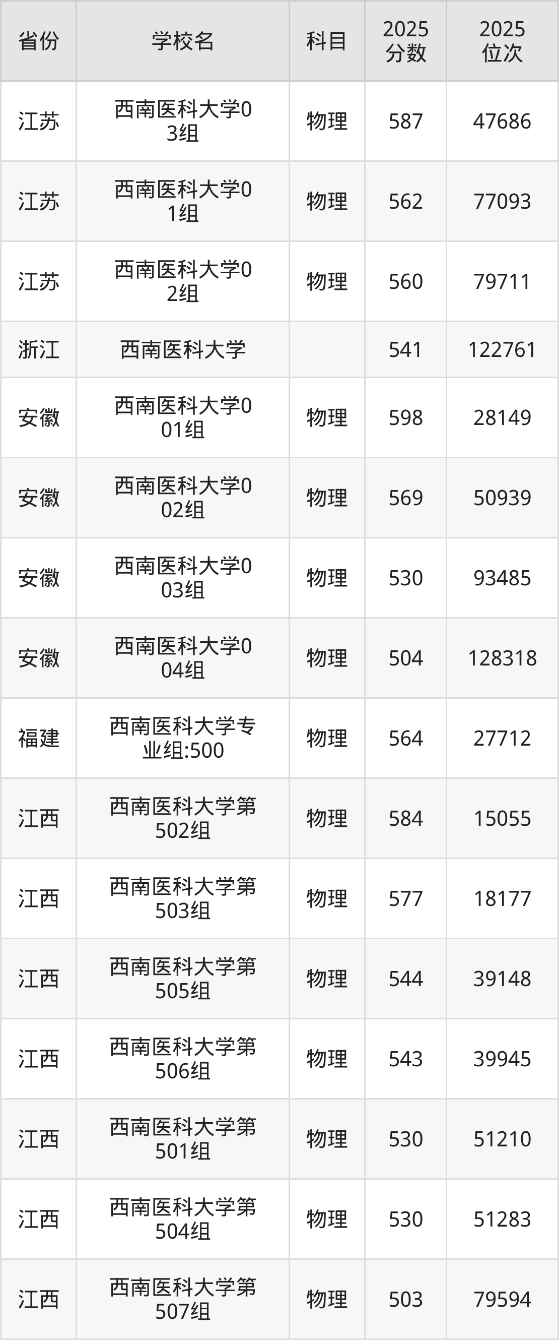 | 西南医科大学专 业组105 | 物理 | 535 | 82339 |