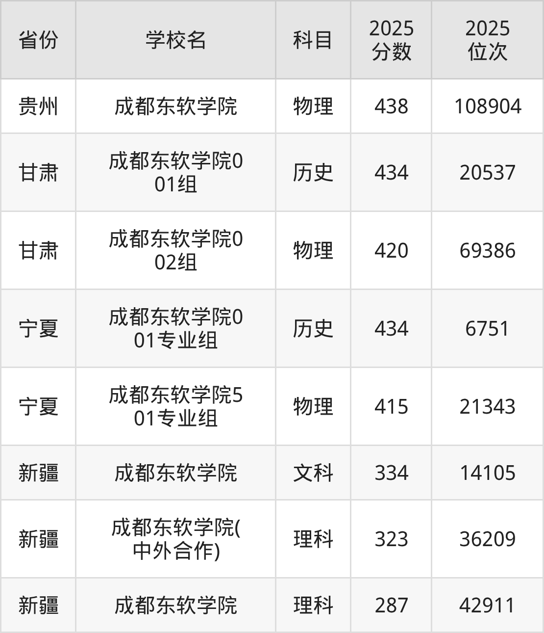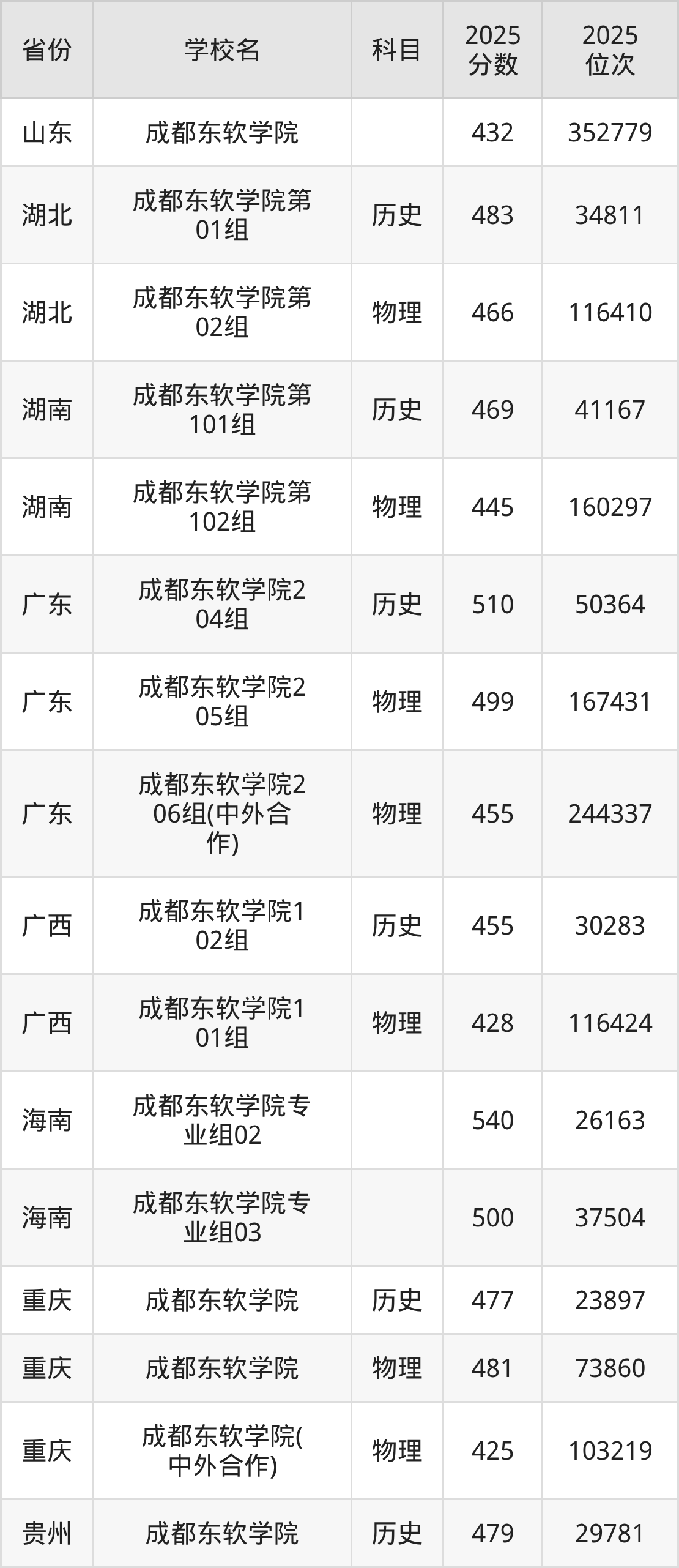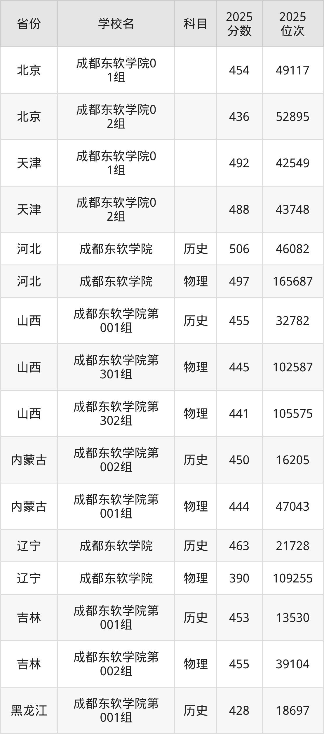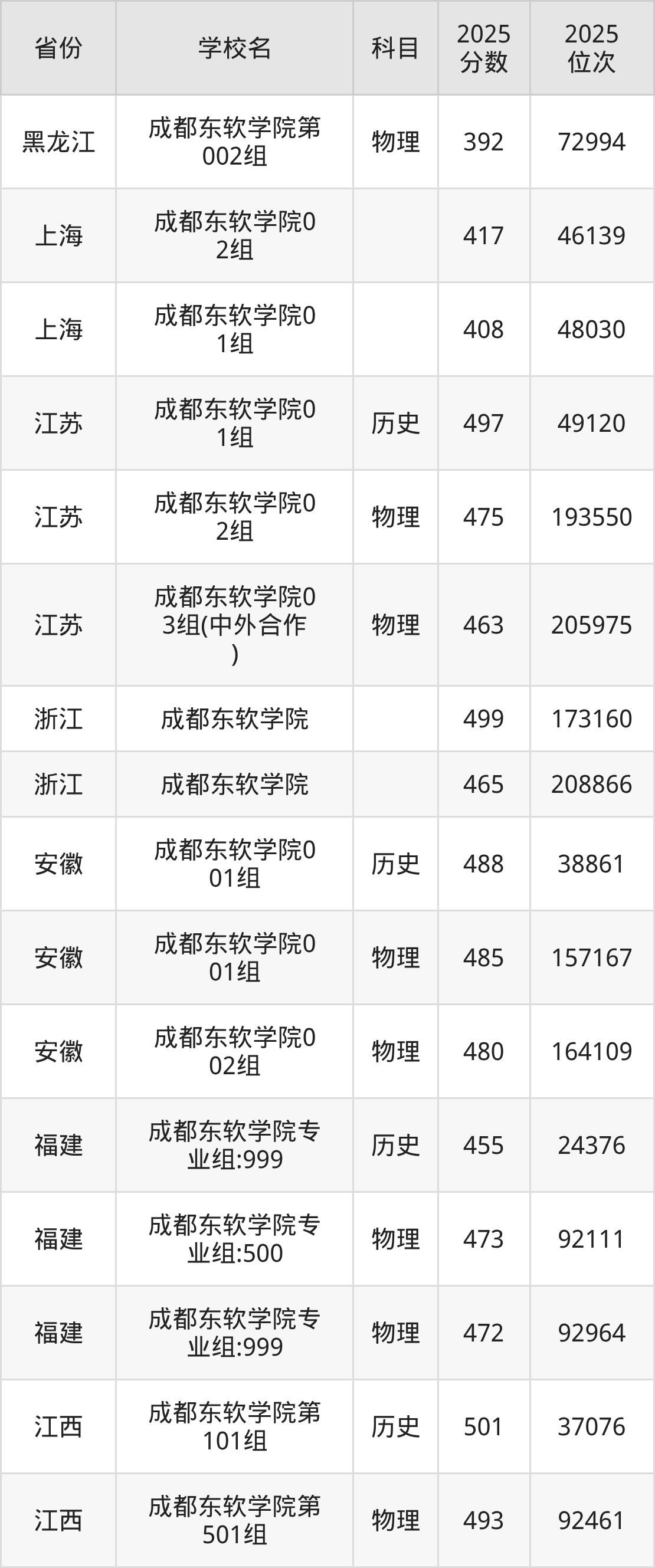 2025年成都东软学院在省内分历史物理科目类录取,其中历史类最低分是475分、对应位次是65102名;物理类最低分是438分,对应位次是207063名。