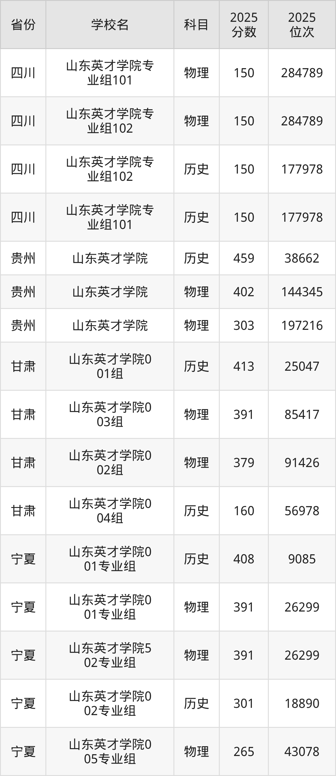 2025年山东英才学院在省外录取分数线范围整体位于150分到507分之间,录取分数线最低在四川物理(专业组101)、录取分数线最高在海南(专业组03)。