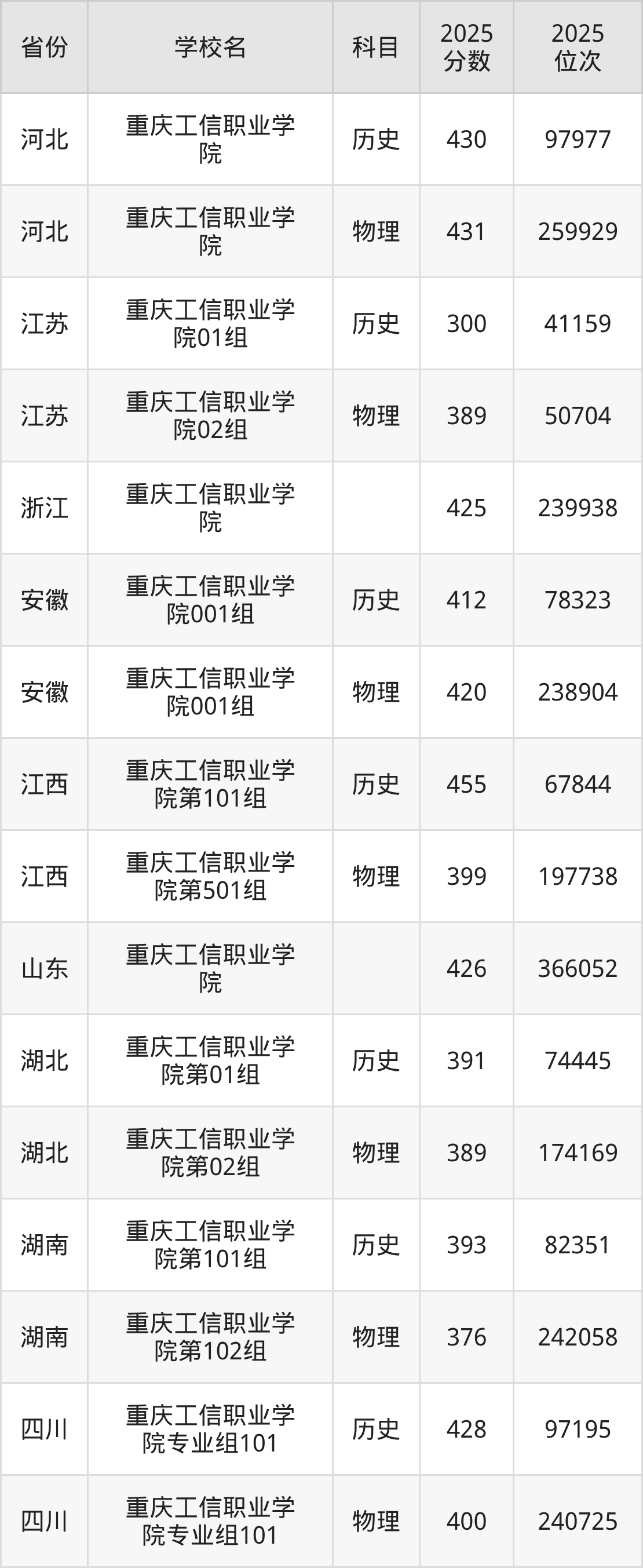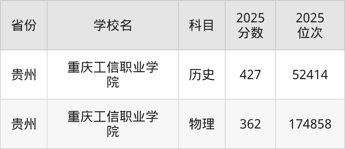 2025年重庆工信职业学院历史类最低分370分(54973名)、物理类最低分359分(125087名)。