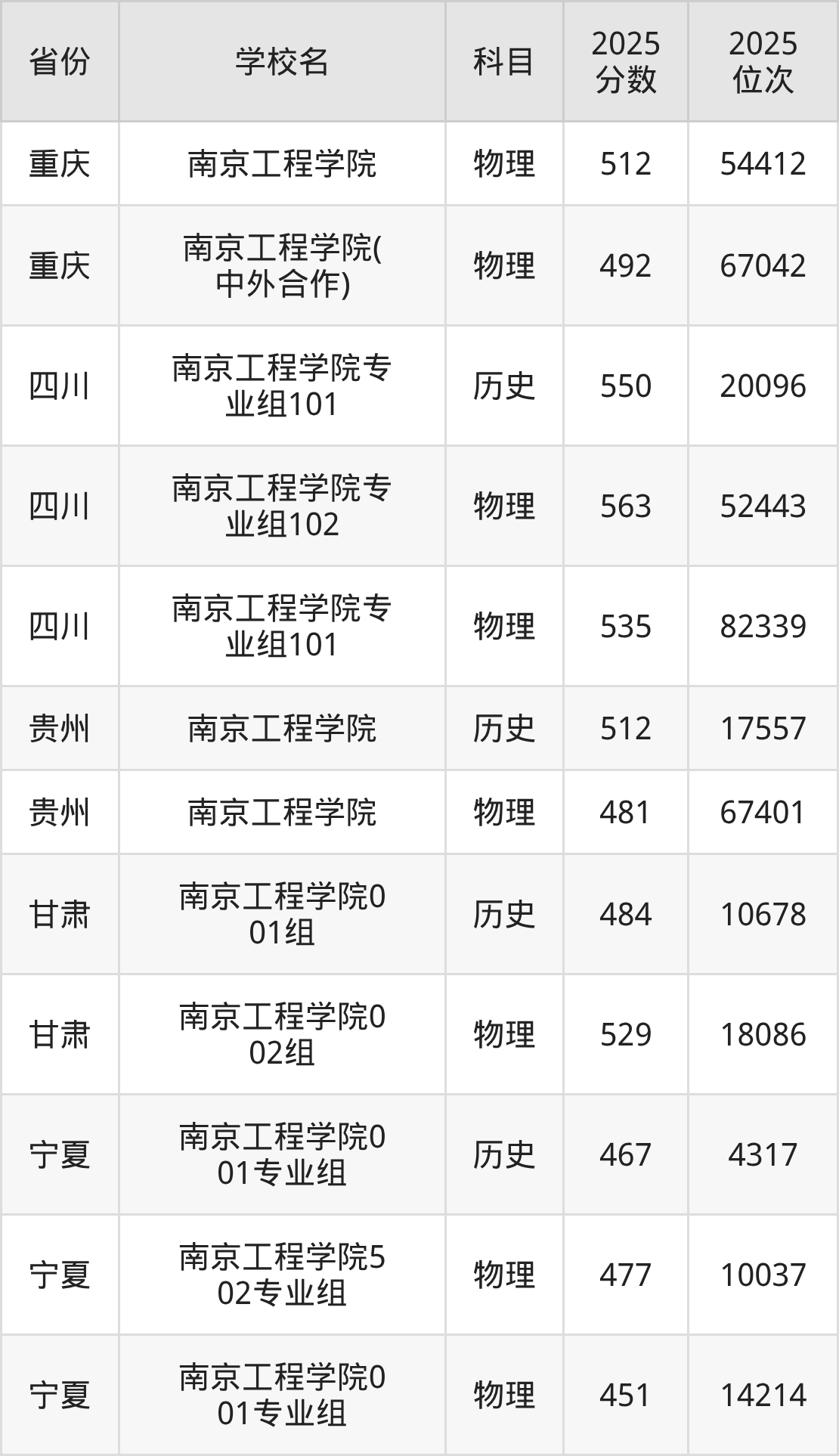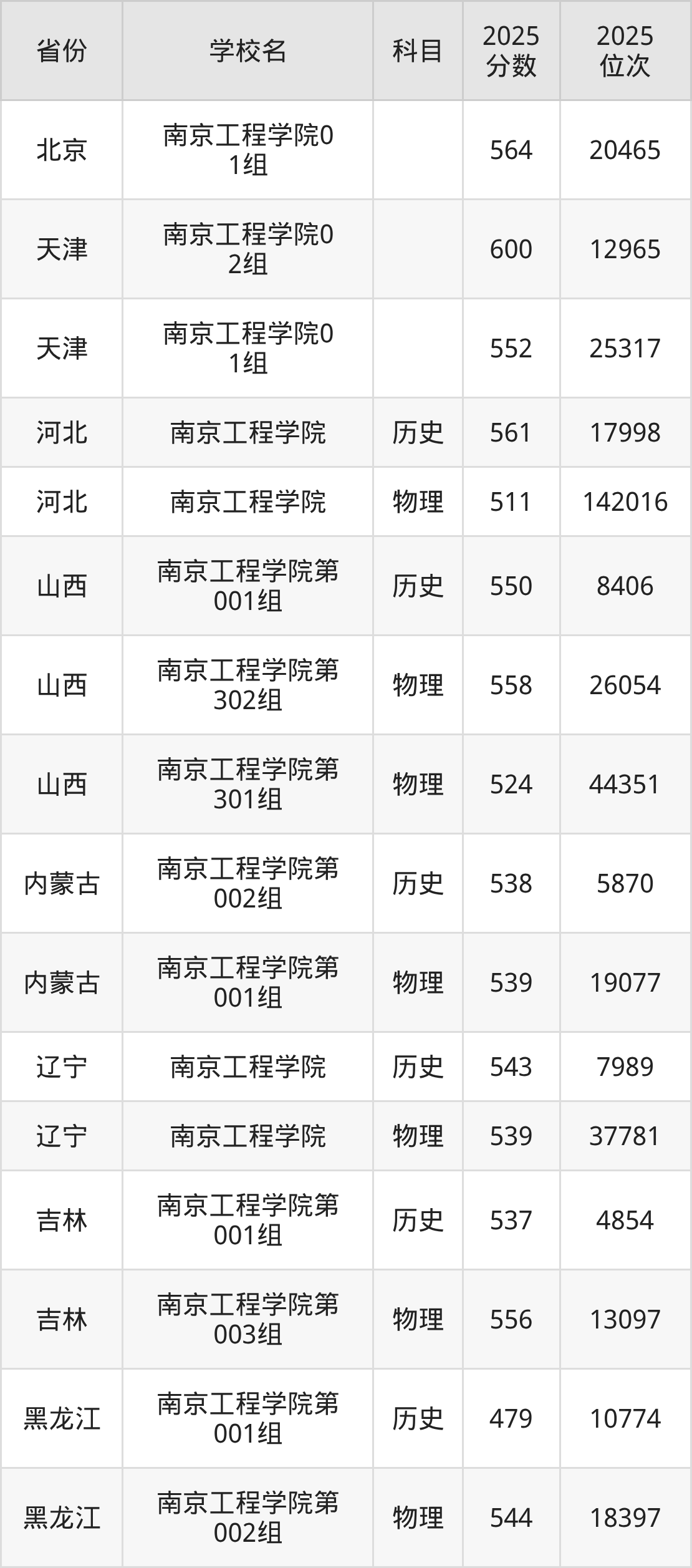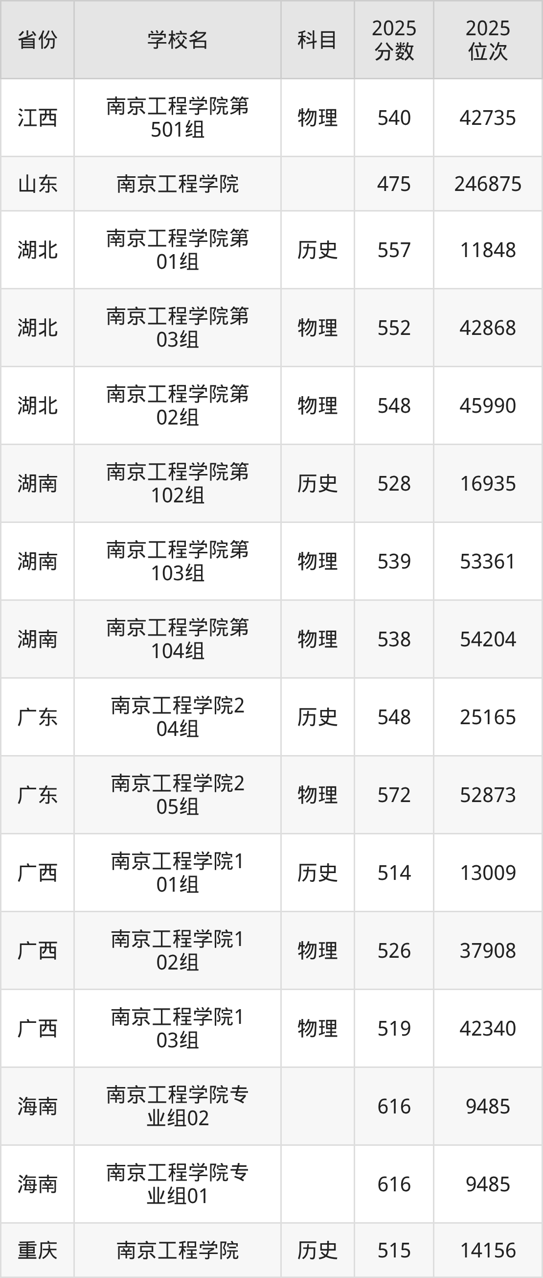 2025年南京工程学院在省内分历史物理科目类录取,其中历史类最低分是543分、对应位次是26982名;物理类最低分是489分,对应位次是177018名。