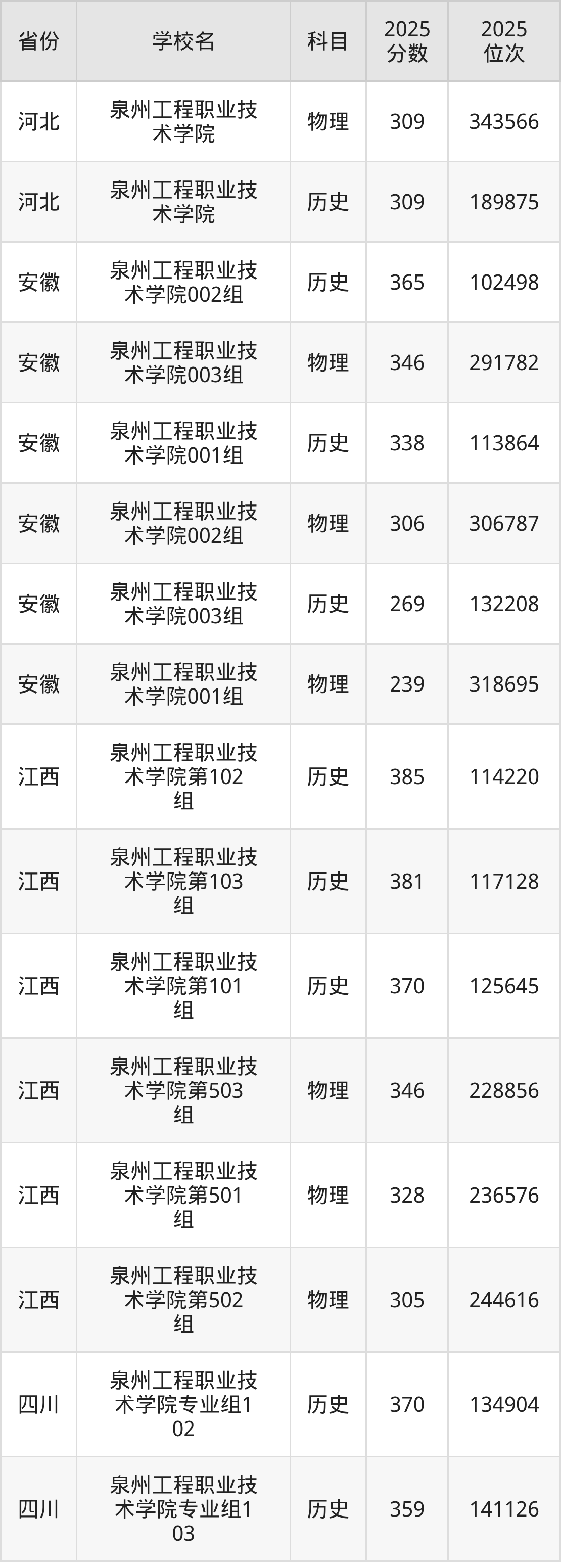 2026年泉州工程职业技术学院录取分数线预计在310分及以上,在各省录取最低分存在一定差异,如:2025年泉州工程职业技术学院在河北录取最低历史类309分、物理类309分,在安徽录取最低历史类269分、物理类239分,在江西录取最低历史类370分、物理类305分。