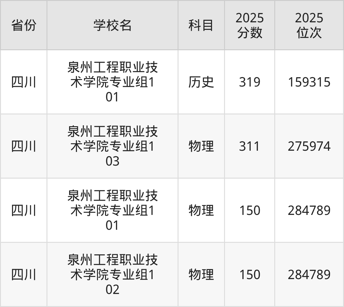 2025年泉州工程职业技术学院在省外录取分数线范围整体位于150分到385分之间,录取分数线最低在四川物理(专业组101)、录取分数线最高在江西历史(第102组)。