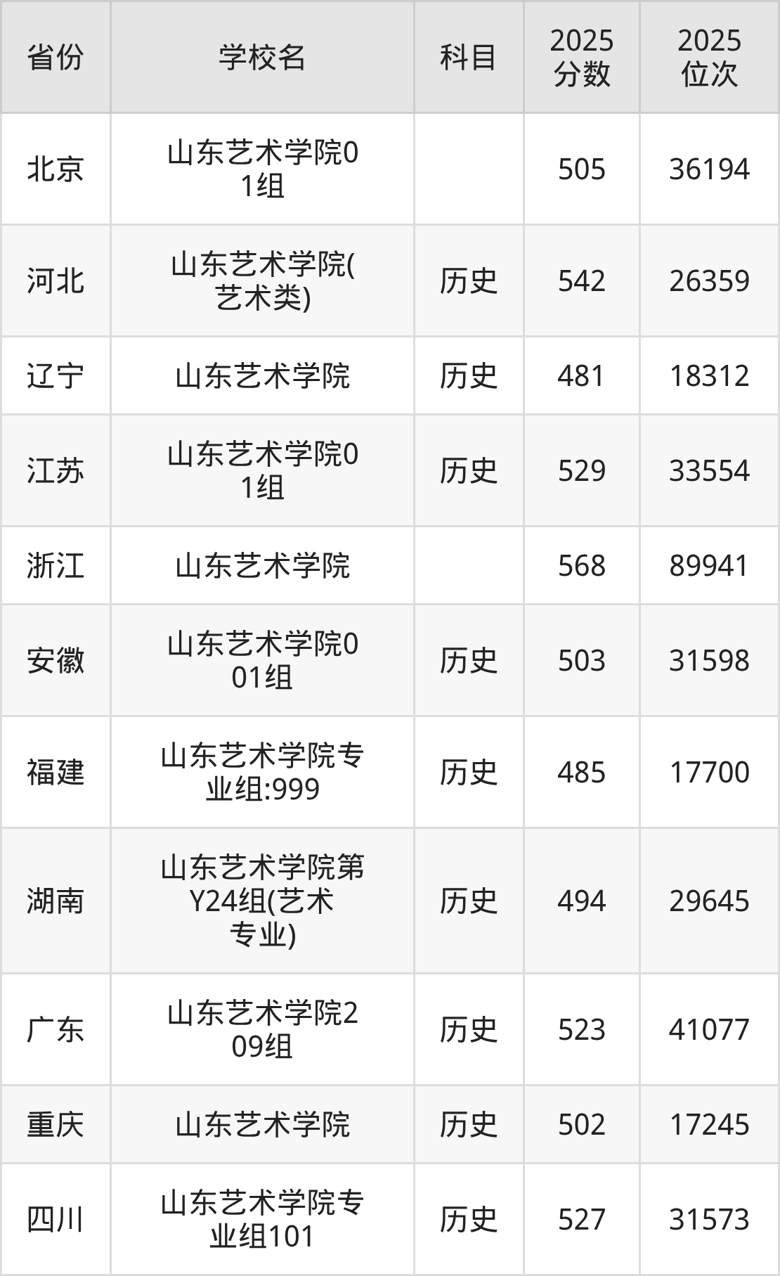 2026年山东艺术学院录取分数线预计在510分及以上,在各省录取最低分存在一定差异,如:2025年山东艺术学院在安徽录取最低历史类503分,在山东录取最低分是500分,在湖南录取最低历史类494分。