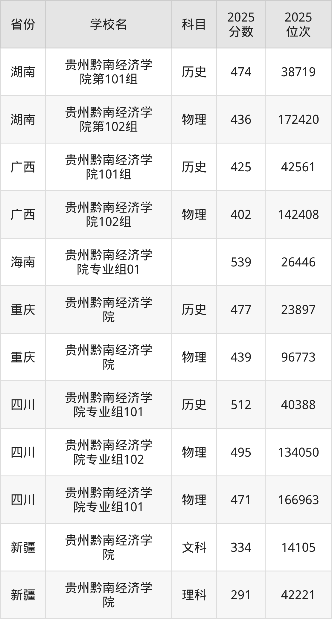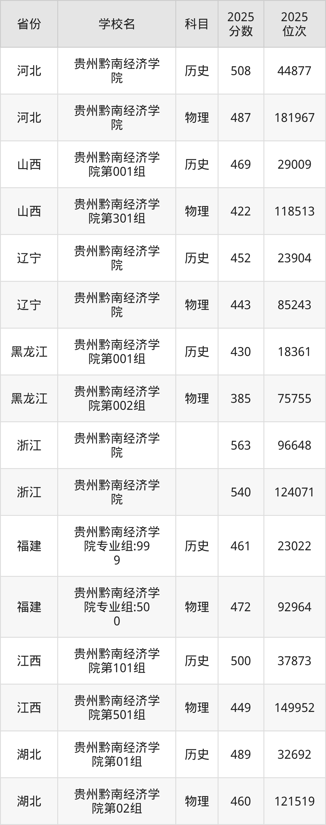 2025年贵州黔南经济学院在省内分历史物理科目类录取,其中历史类最低分是464分、对应位次是36475名;物理类最低分是401分,对应位次是145322名。