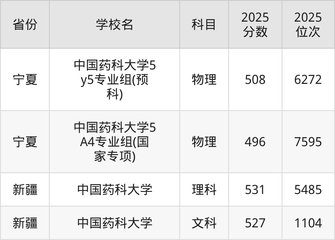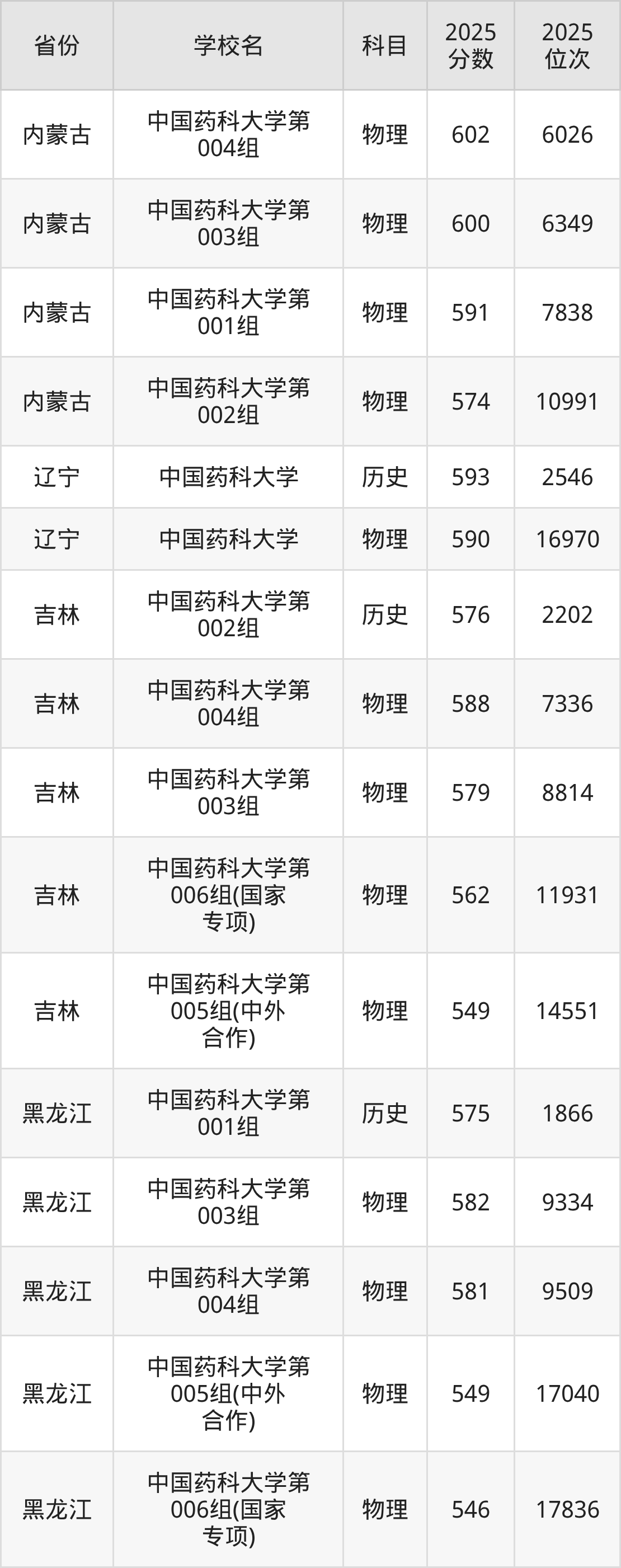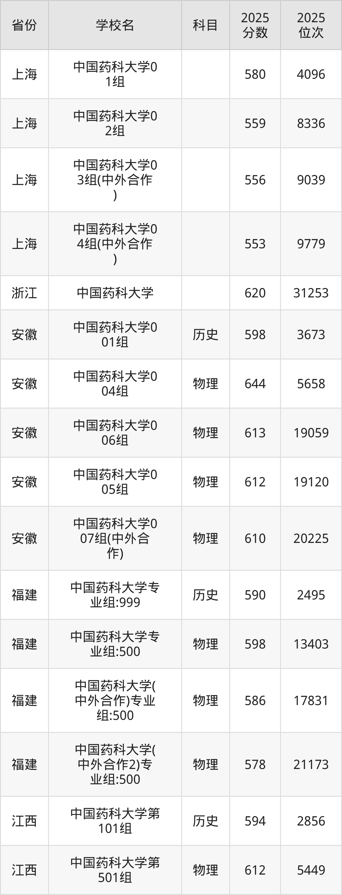 2025年中国药科大学历史类最低分591分(8106名)、物理类最低分597分(37720名)。