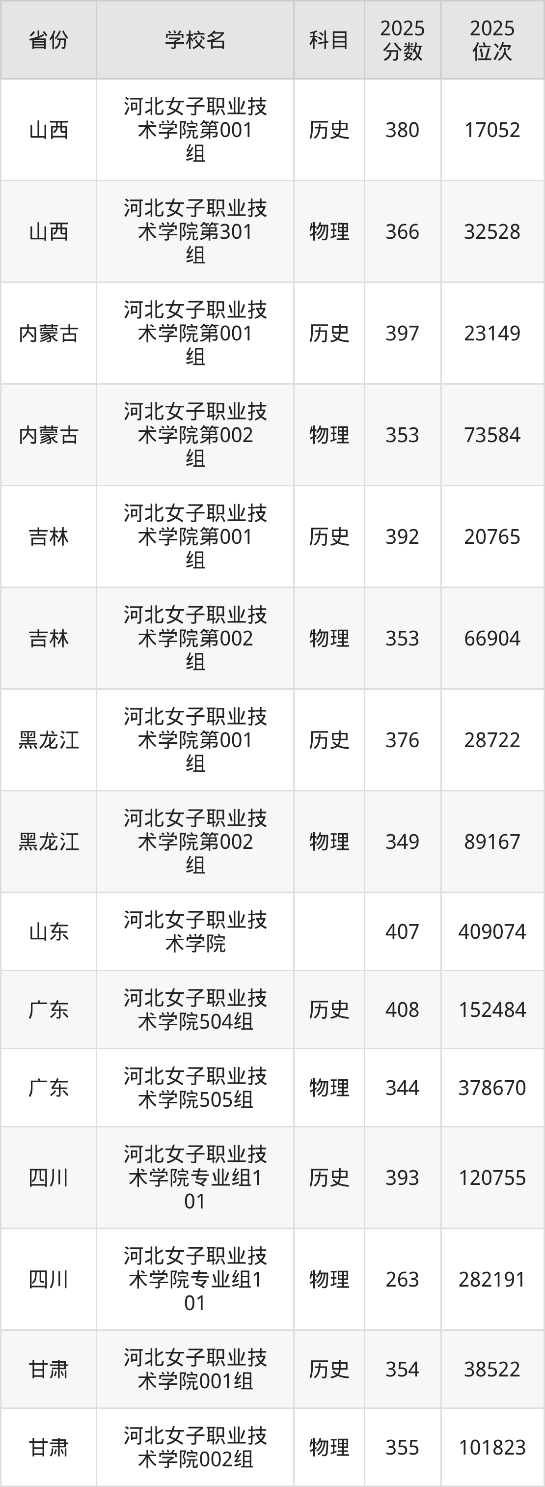2025年河北女子职业技术学院历史类最低分397分(123521名)、物理类最低分385分(304225名)。
