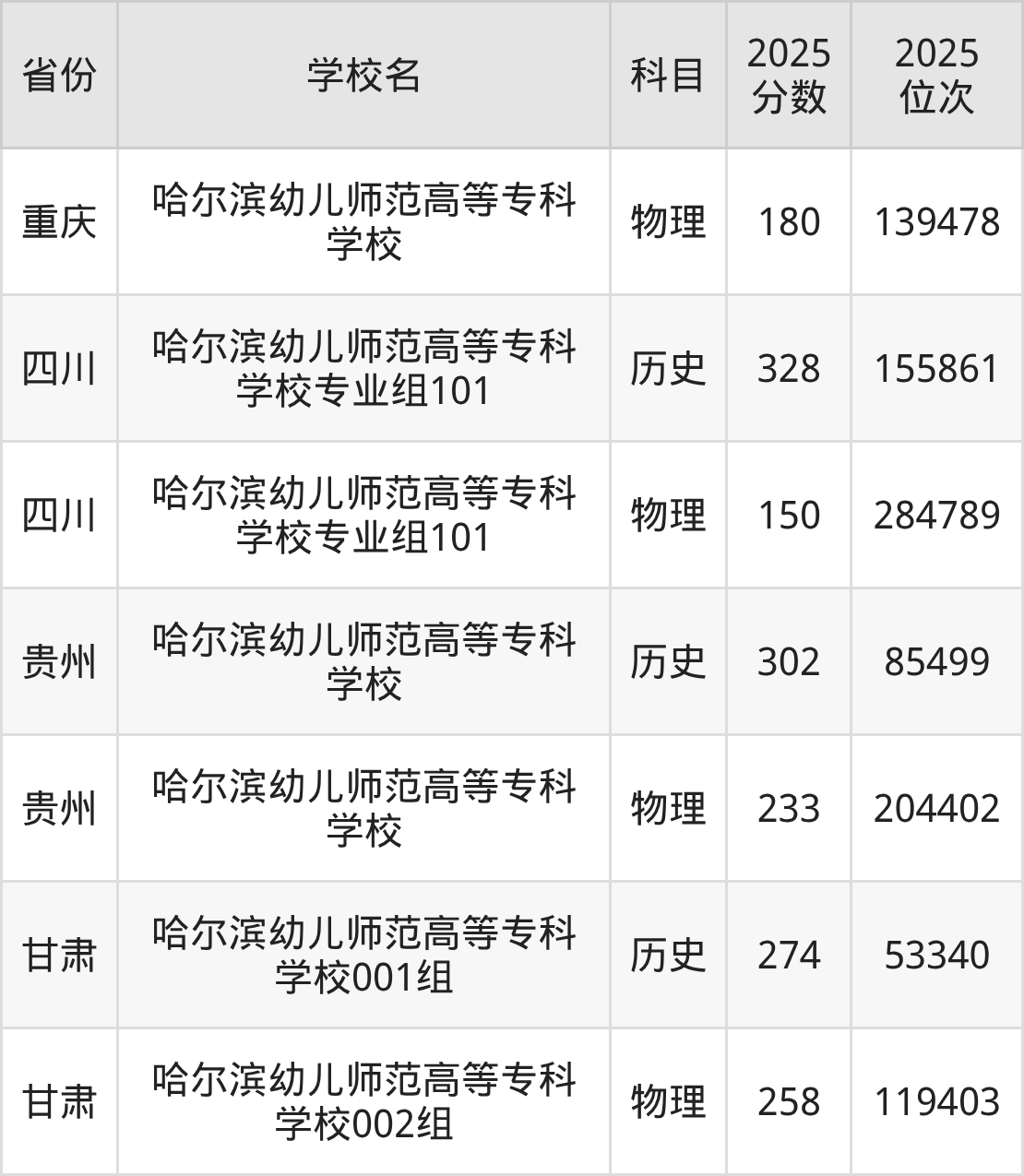 2025年哈尔滨幼儿师范高等专科学校历史类最低分236分(52159名)、物理类最低分164分(117285名)。