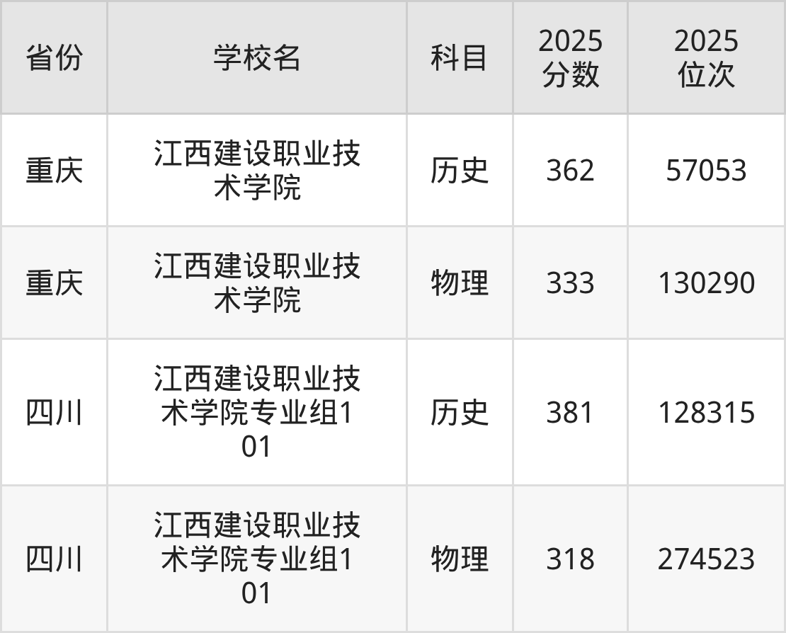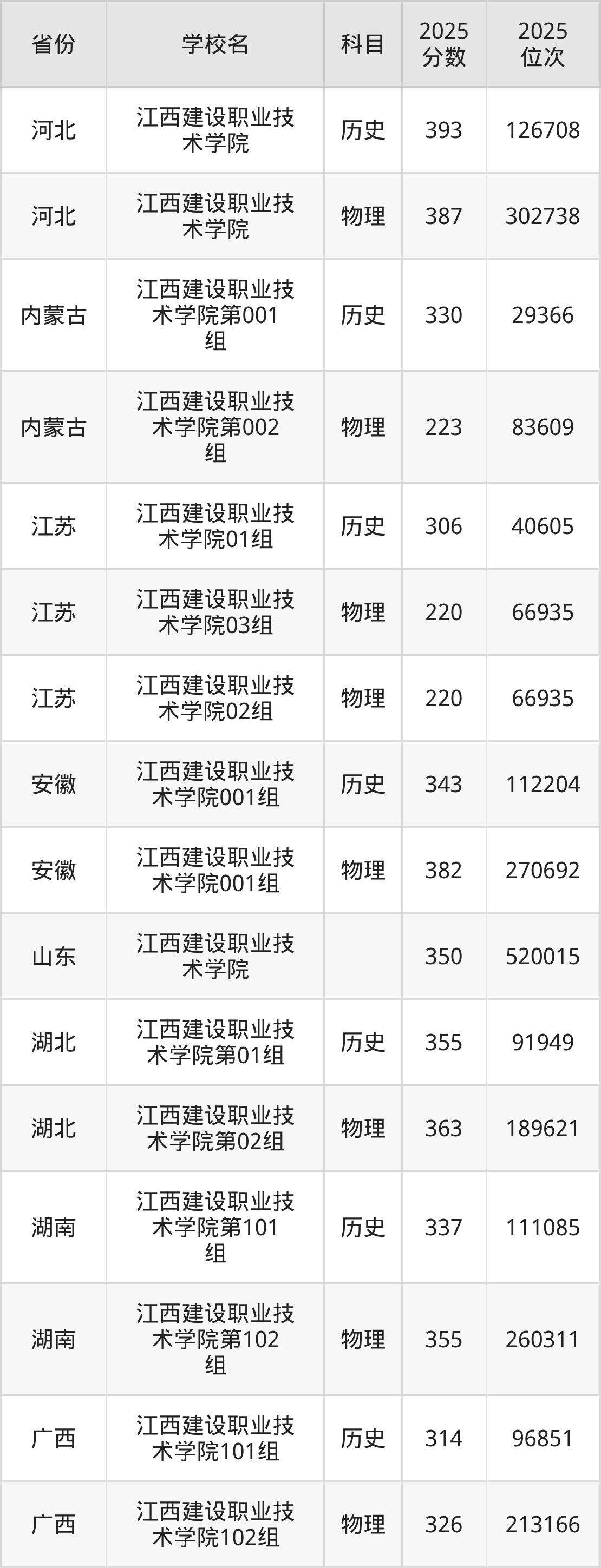 2025年江西建设职业技术学院历史类最低分398分(104827名)、物理类最低分281分(251363名)。
