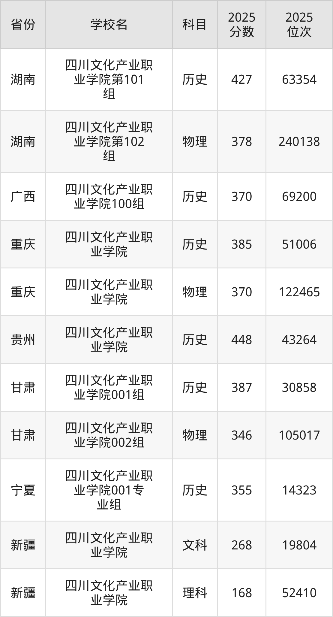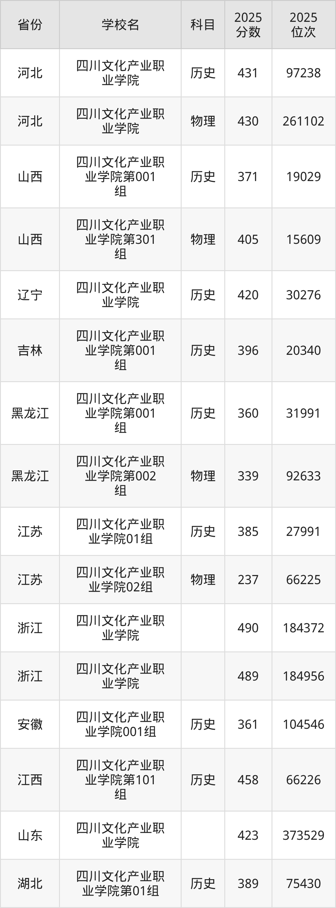 2025年四川文化产业职业学院在省内分历史物理科目类录取,其中历史类最低分是449分、对应位次是83125名;物理类最低分是364分,对应位次是260348名。