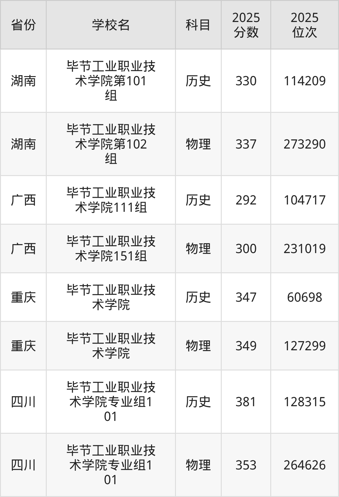 2025年毕节工业职业技术学院历史类最低分184分(88390名)、物理类最低分184分(204969名)。