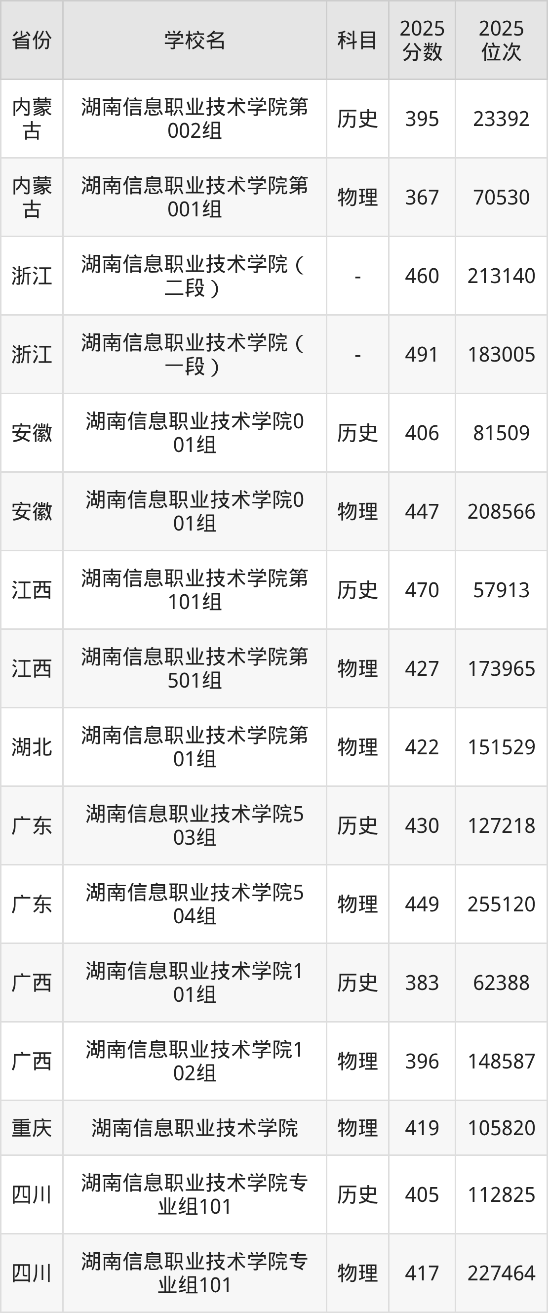 2025年湖南信息职业技术学院历史类最低分413分(71109名)、物理类最低分399分(218266名)。