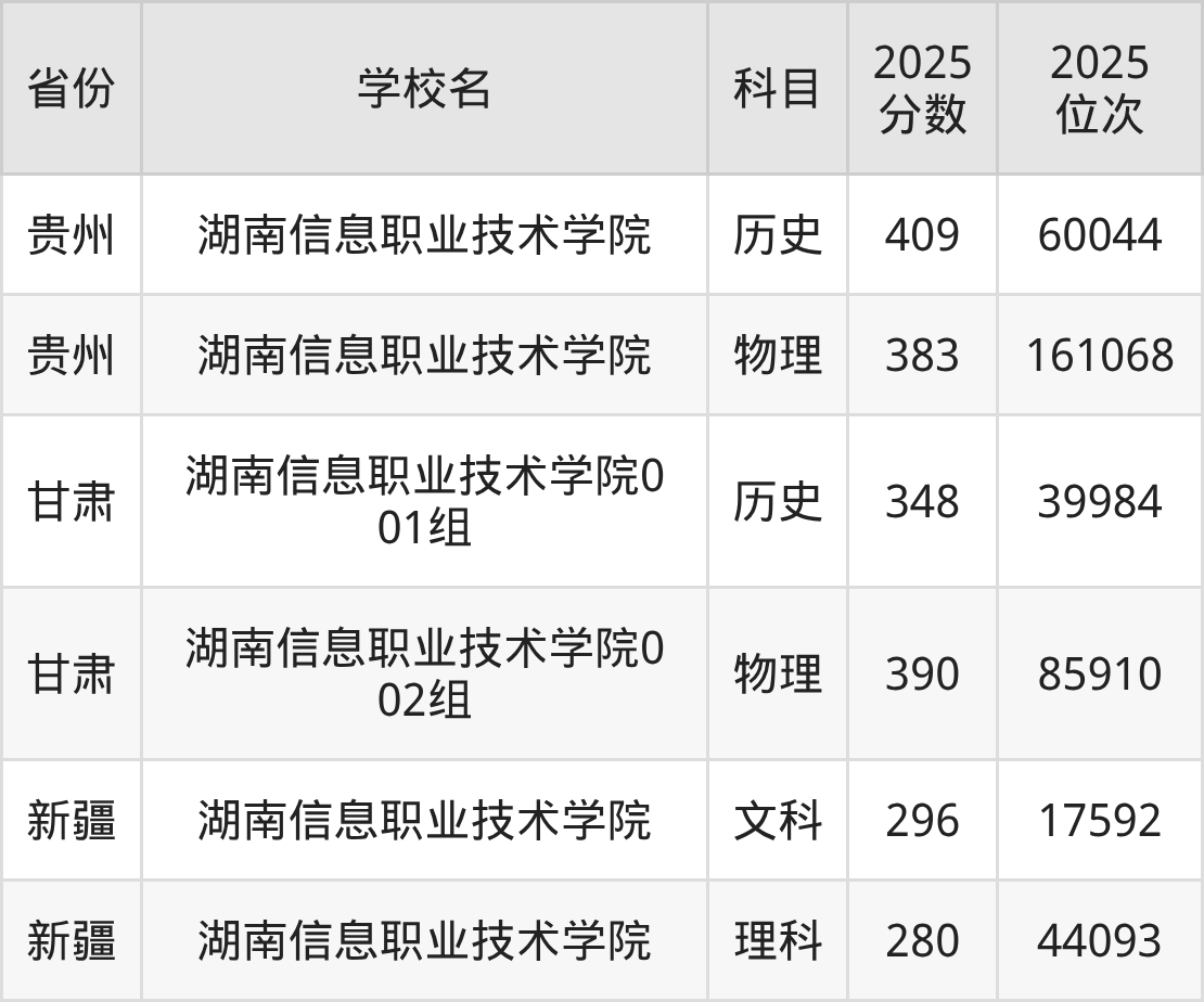 2025年湖南信息职业技术学院在省内,其中历史类最低分是413分、对应位次是71109名;物理类最低分是399分,对应位次是218266名。