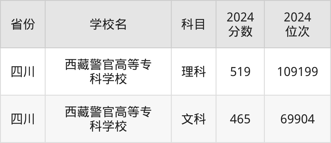 高考录取中,各个大学的分数线波动较大,因此建议各位考生参考近三年的数据,下面是西藏警官高等专科学校在四川近两年最低录取分数线及位次排名汇总。