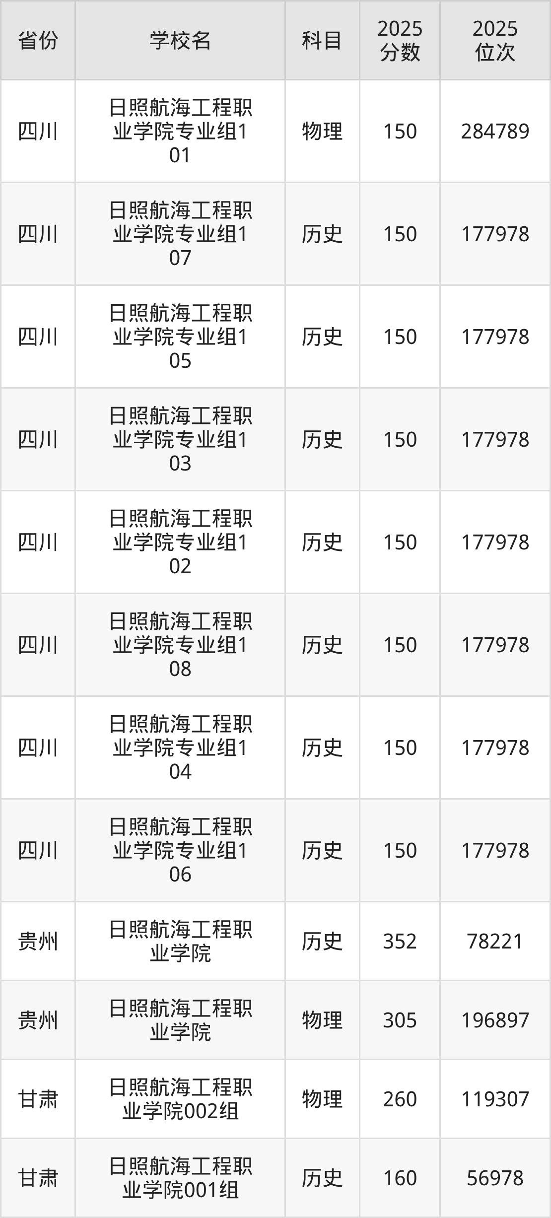 2025年日照航海工程职业学院在省外录取分数线范围整体位于150分到375分之间,录取分数线最低在四川物理(专业组105)、录取分数线最高在广东历史(503组)。