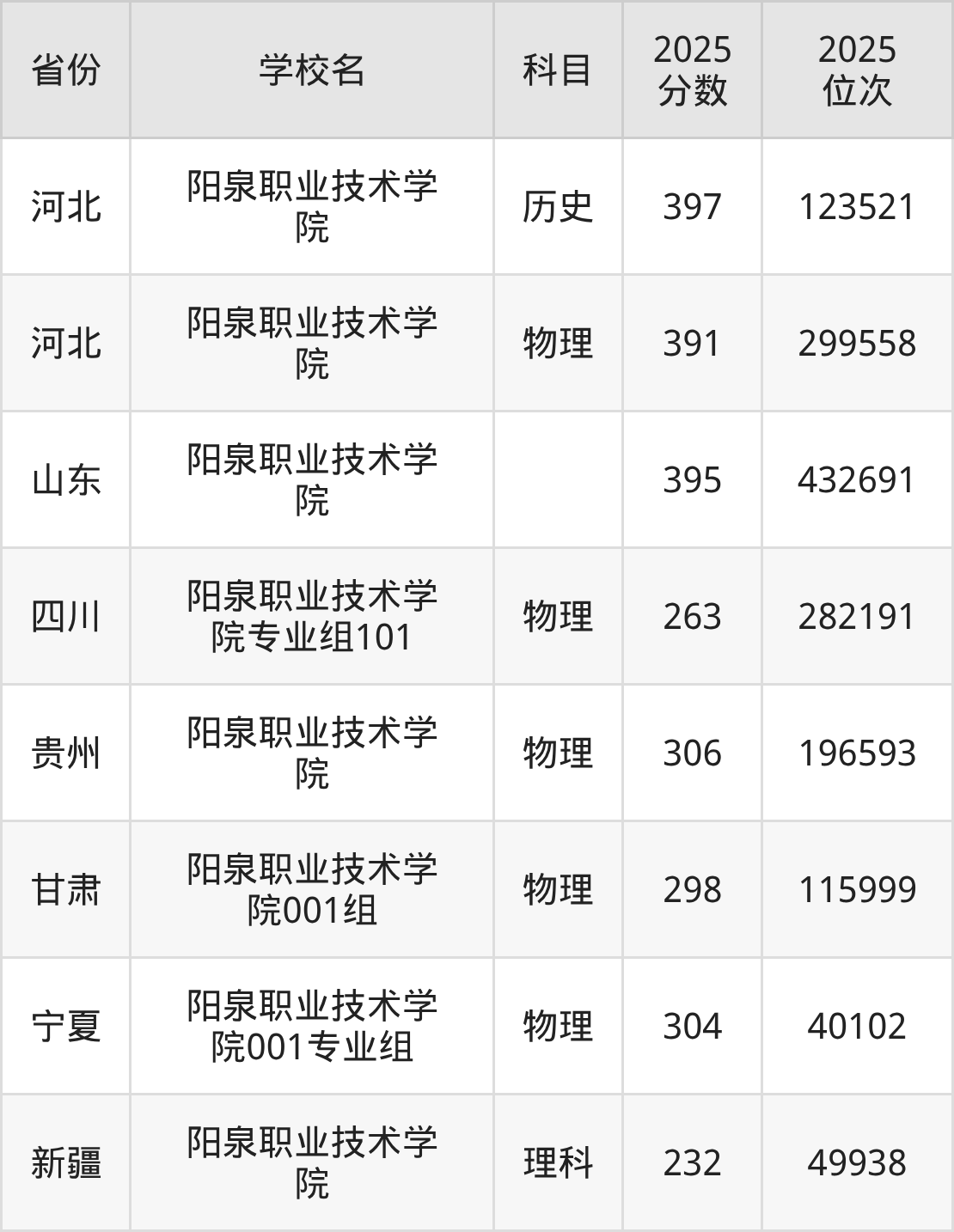 下面是阳泉职业技术学院2025年录取分数线各省汇总,一起来了解下吧。