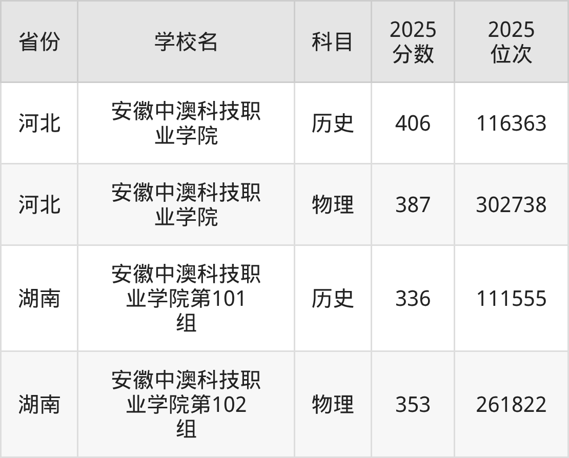 2025年安徽中澳科技职业学院历史类最低分372分(99132名)、物理类最低分373分(276952名)。