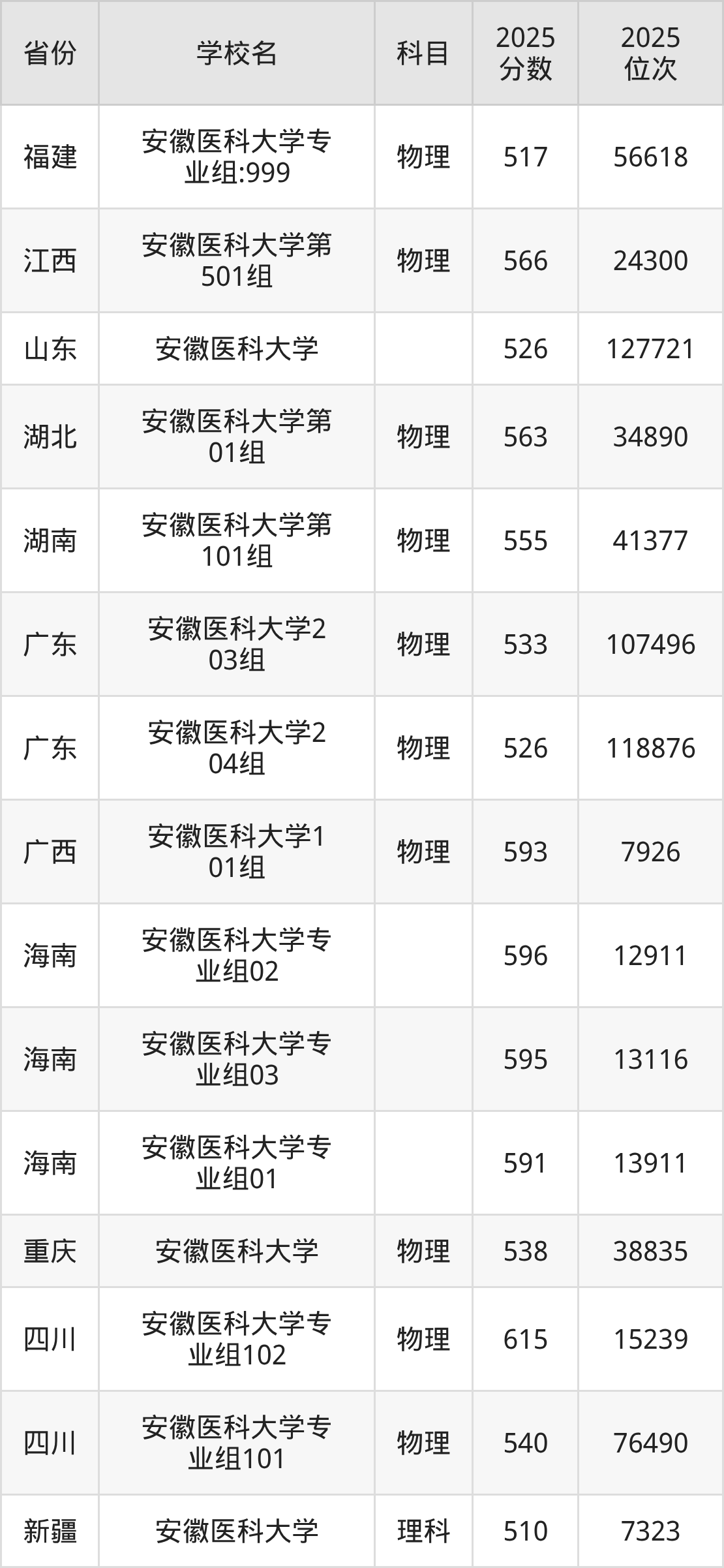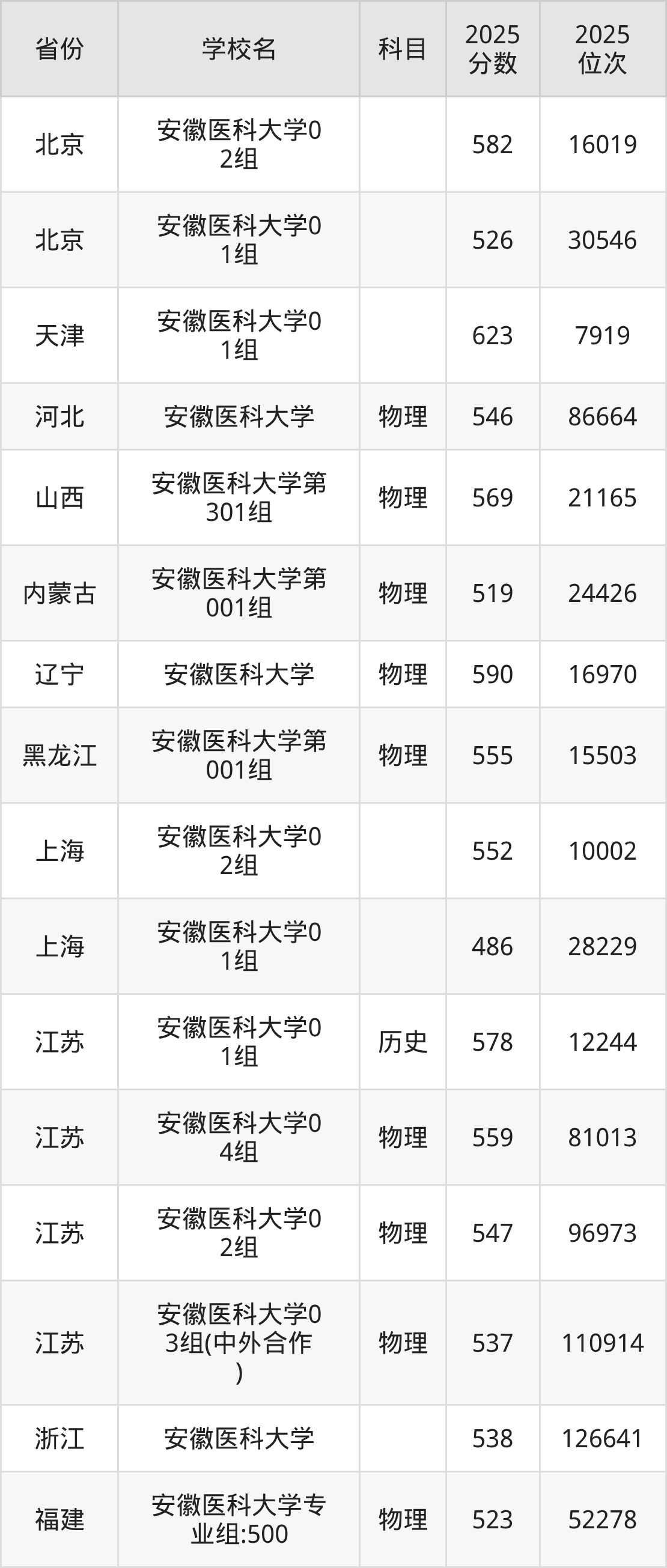 2025年安徽医科大学历史类最低分525分(22340名)、物理类最低分515分(112439名)。