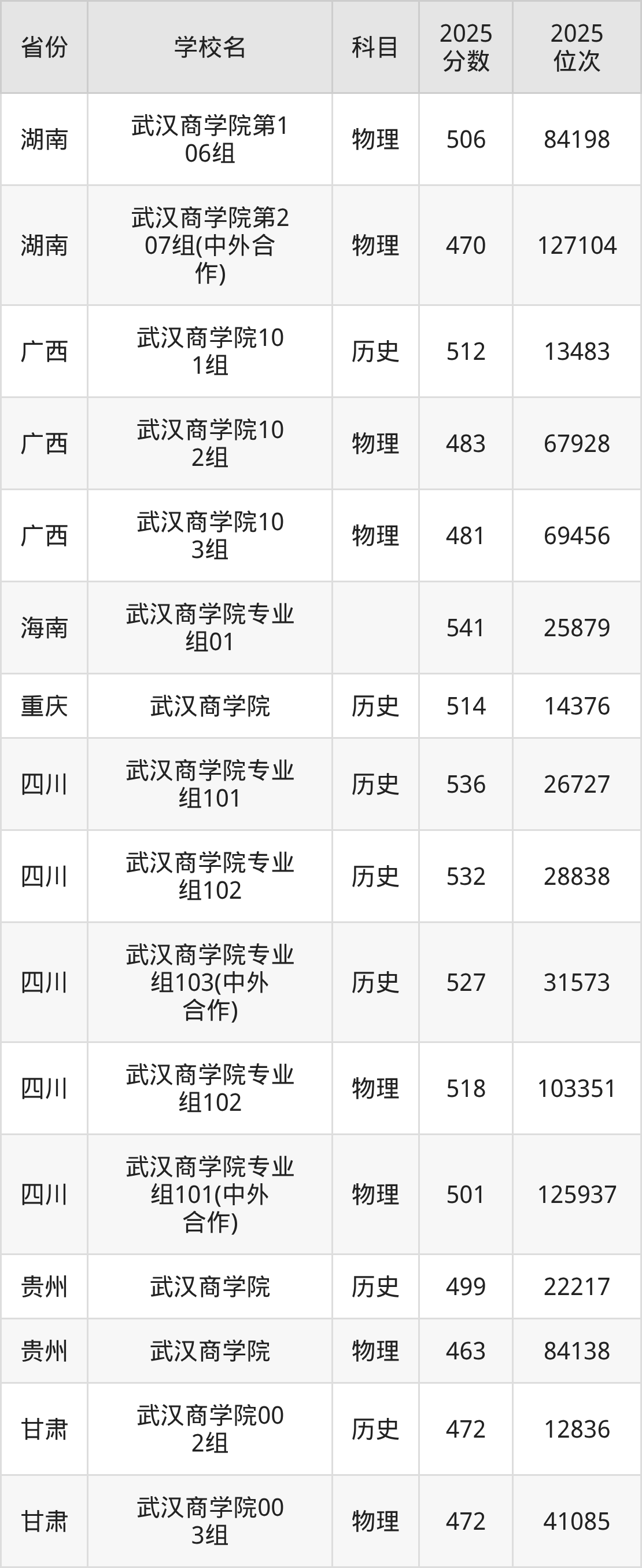 2025年武汉商学院在省内分历史物理科目类录取,其中历史类最低分是448分、对应位次是48485名;物理类最低分是431分,对应位次是144889名。