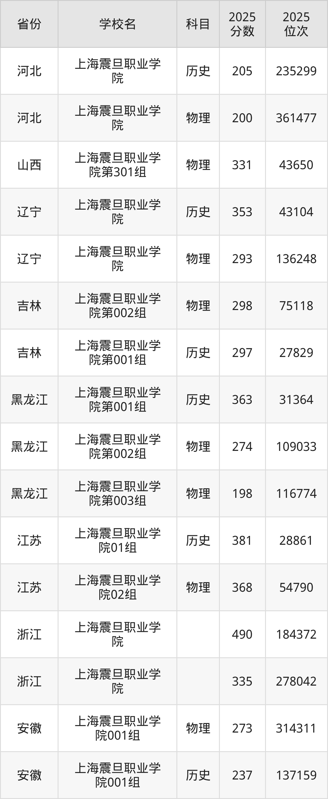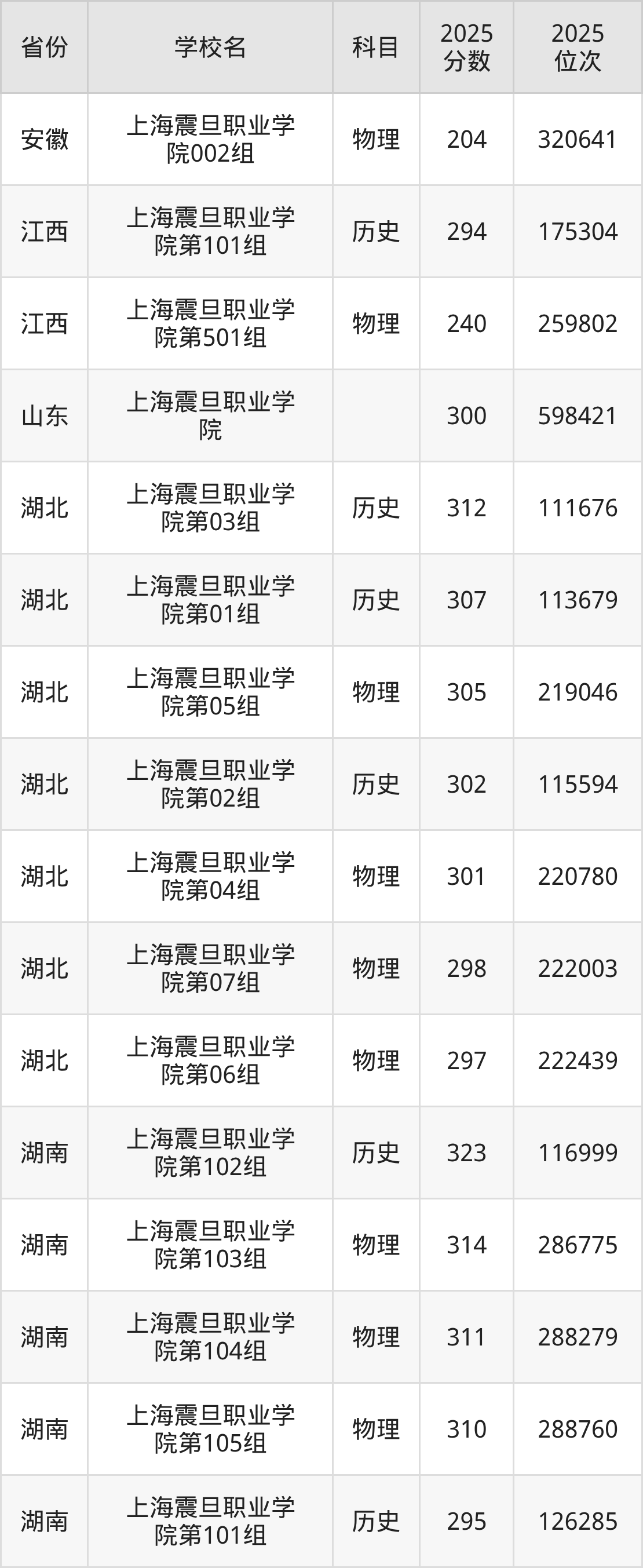 2026年上海震旦职业学院录取分数线预计在300分及以上,在各省录取最低分存在一定差异,如:2025年上海震旦职业学院在辽宁录取最低历史类353分、物理类293分,在江苏录取最低历史类381分、物理类368分,在江西录取最低历史类294分、物理类240分。
