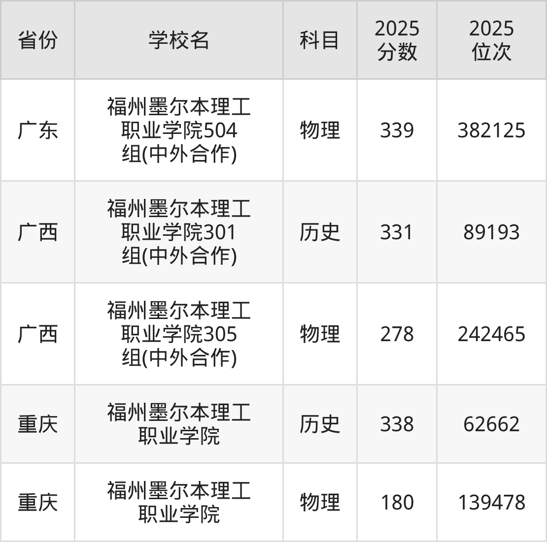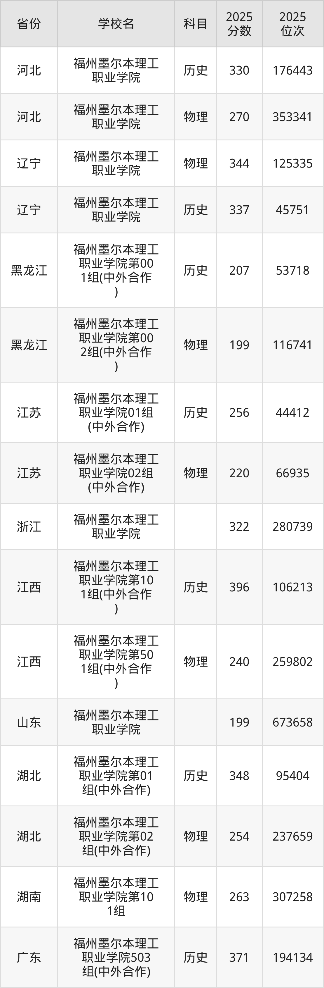 下面是福州墨尔本理工职业学院2025年录取分数线各省汇总,一起来了解下吧。