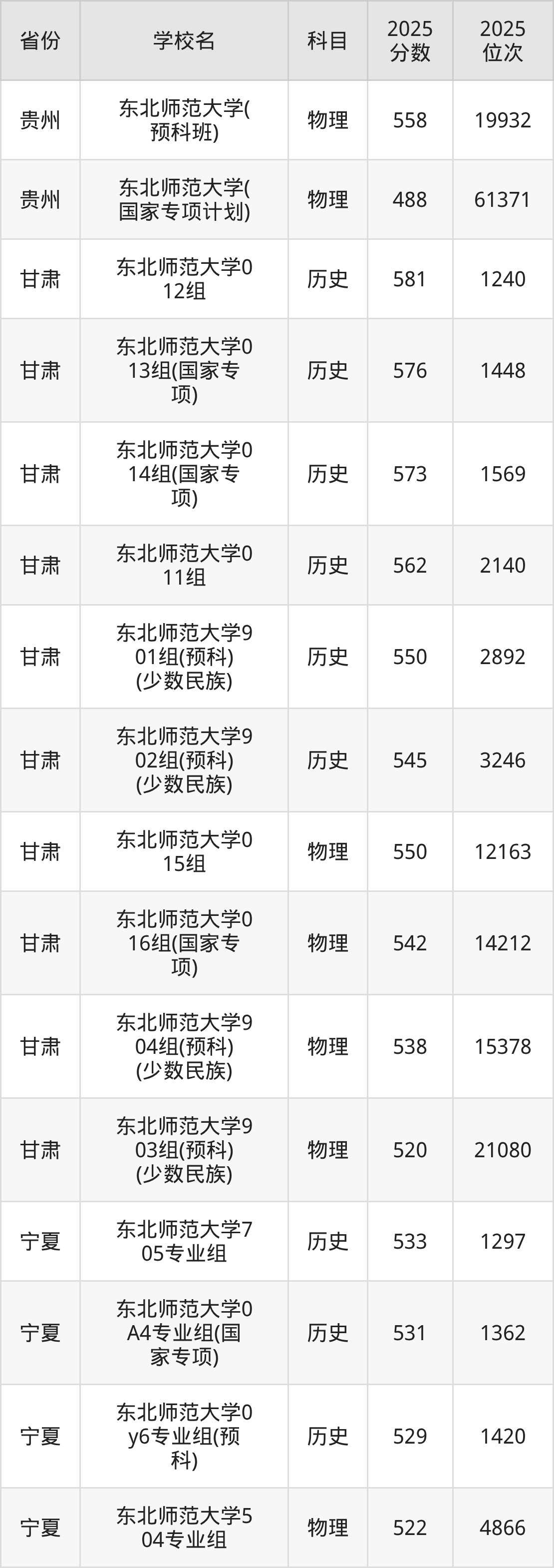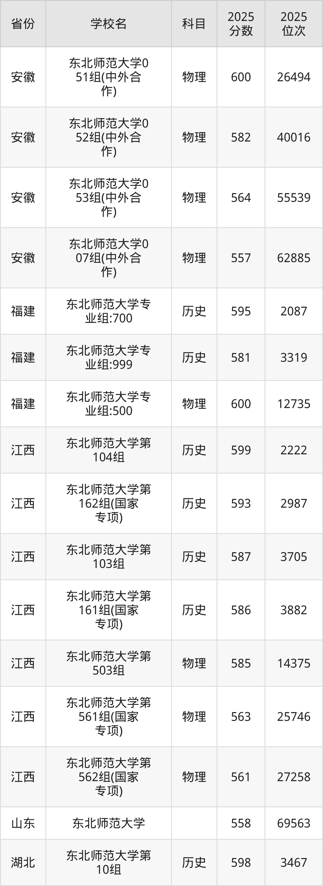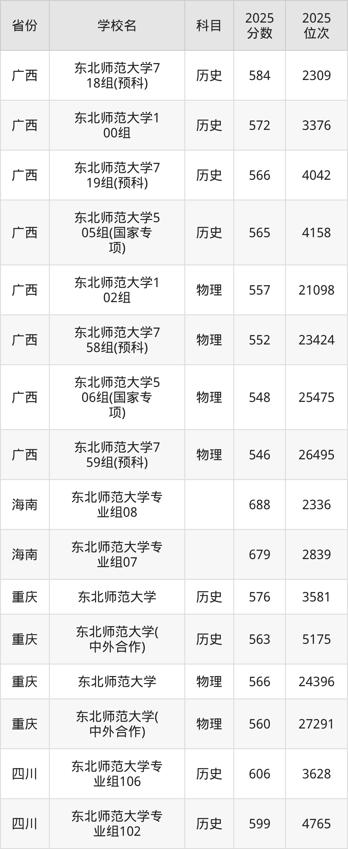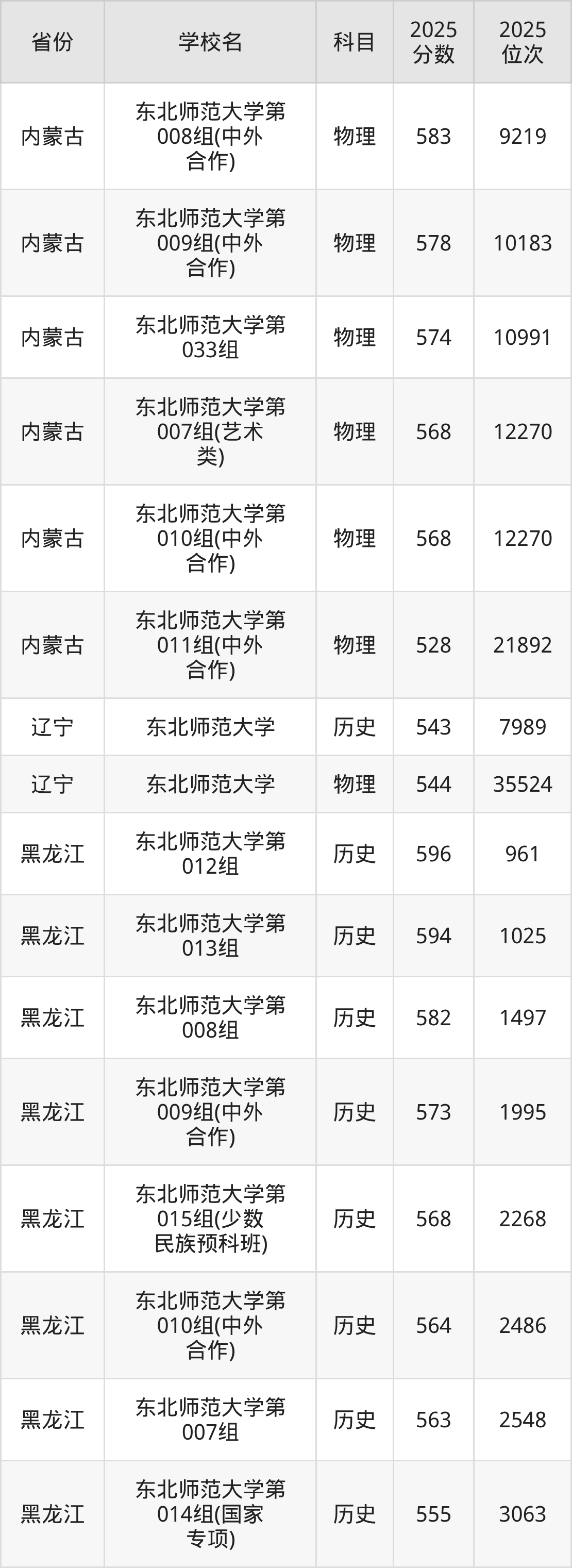 2025年东北师范大学历史类最低分562分(3025名)、物理类最低分540分(16442名)。