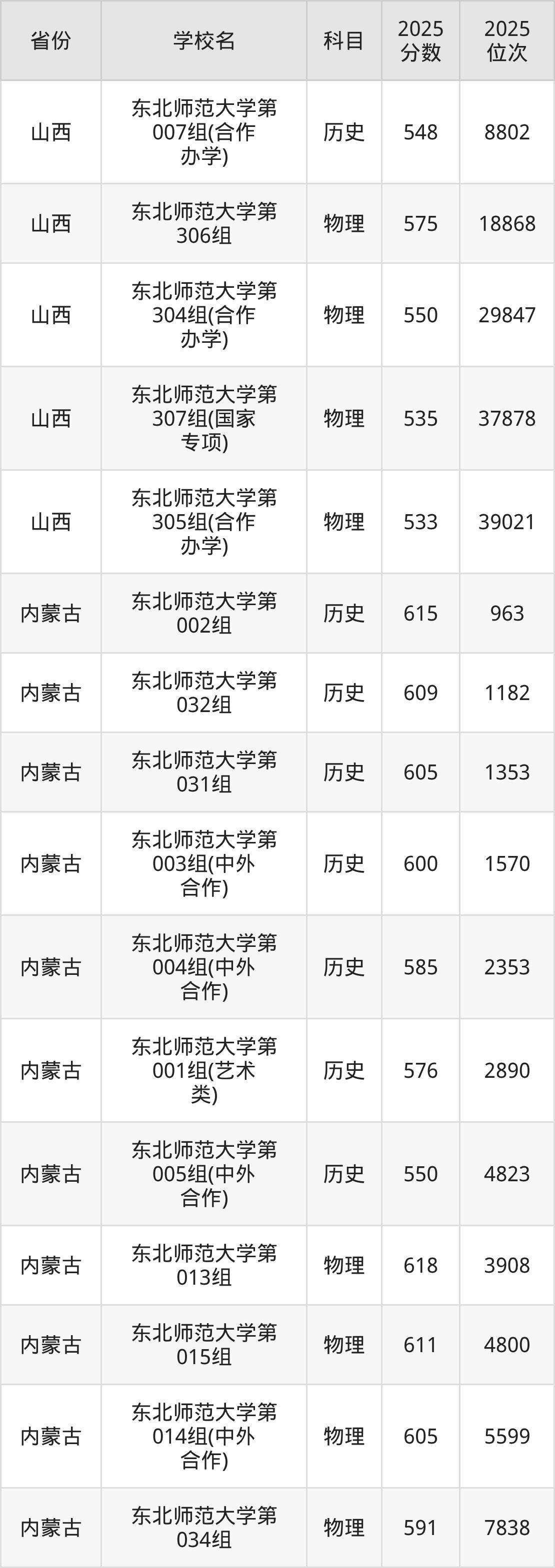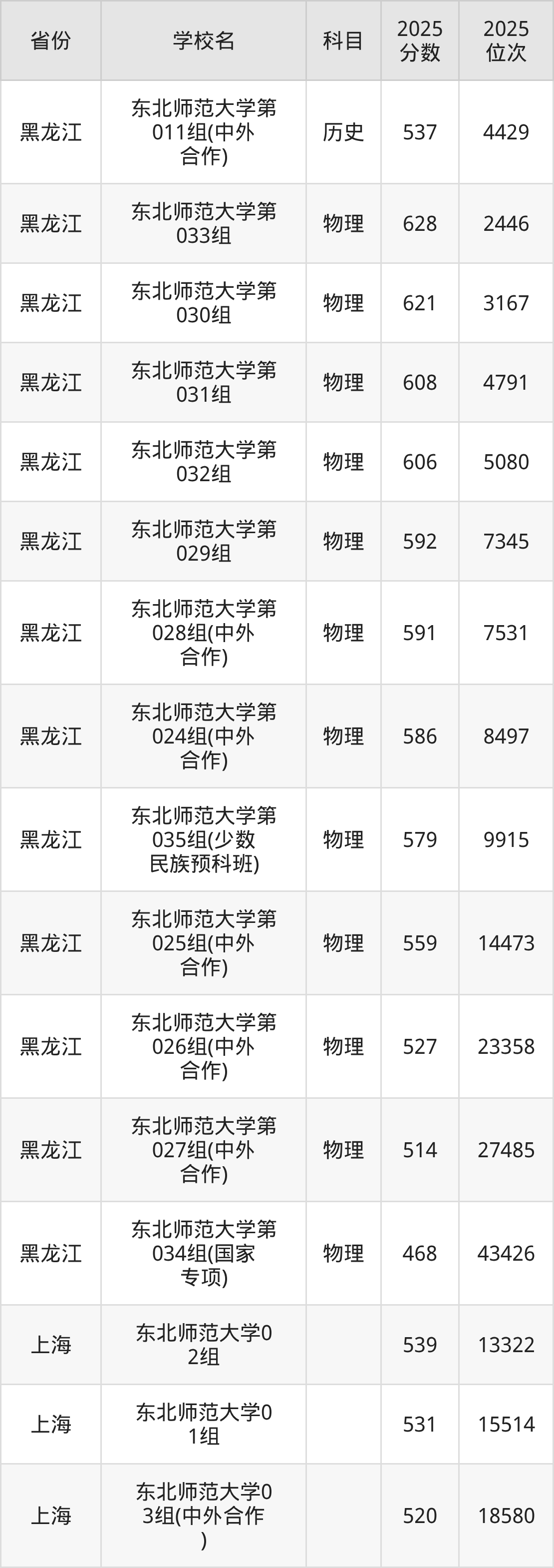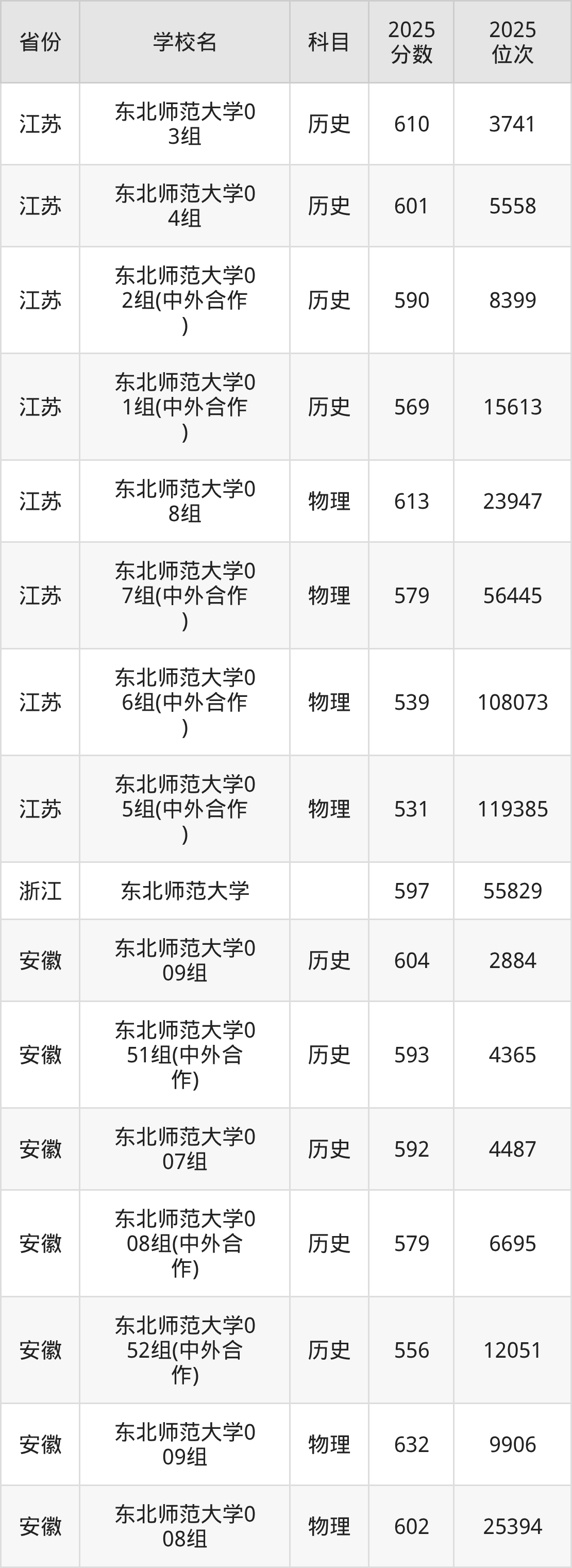 2025年东北师范大学历史类最低分562分(3025名)、物理类最低分540分(16442名)。