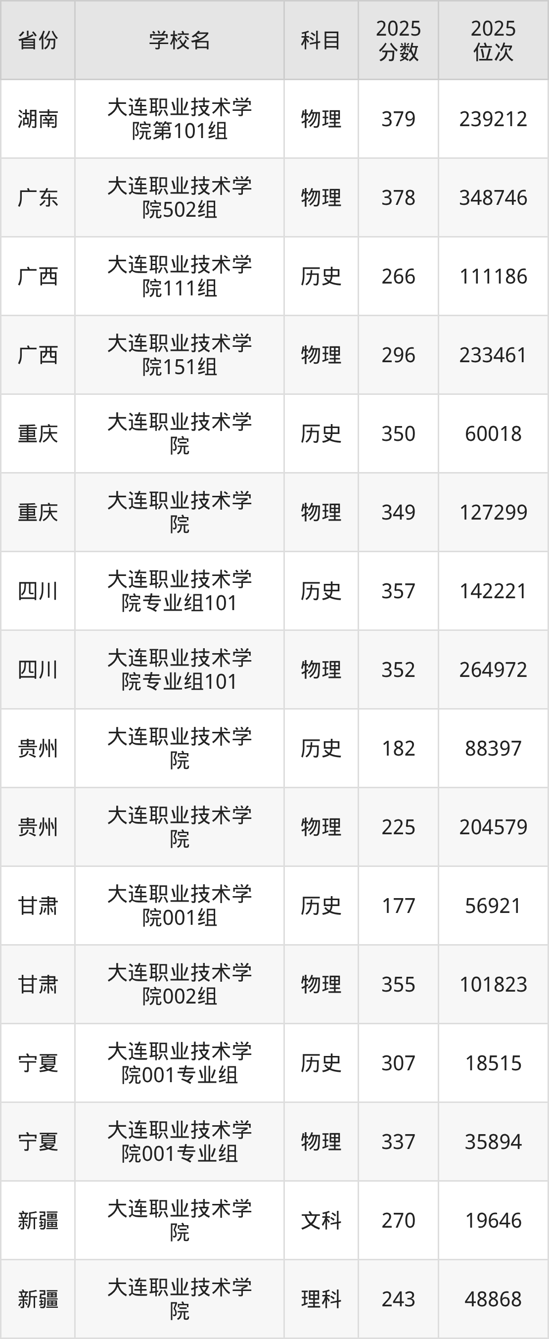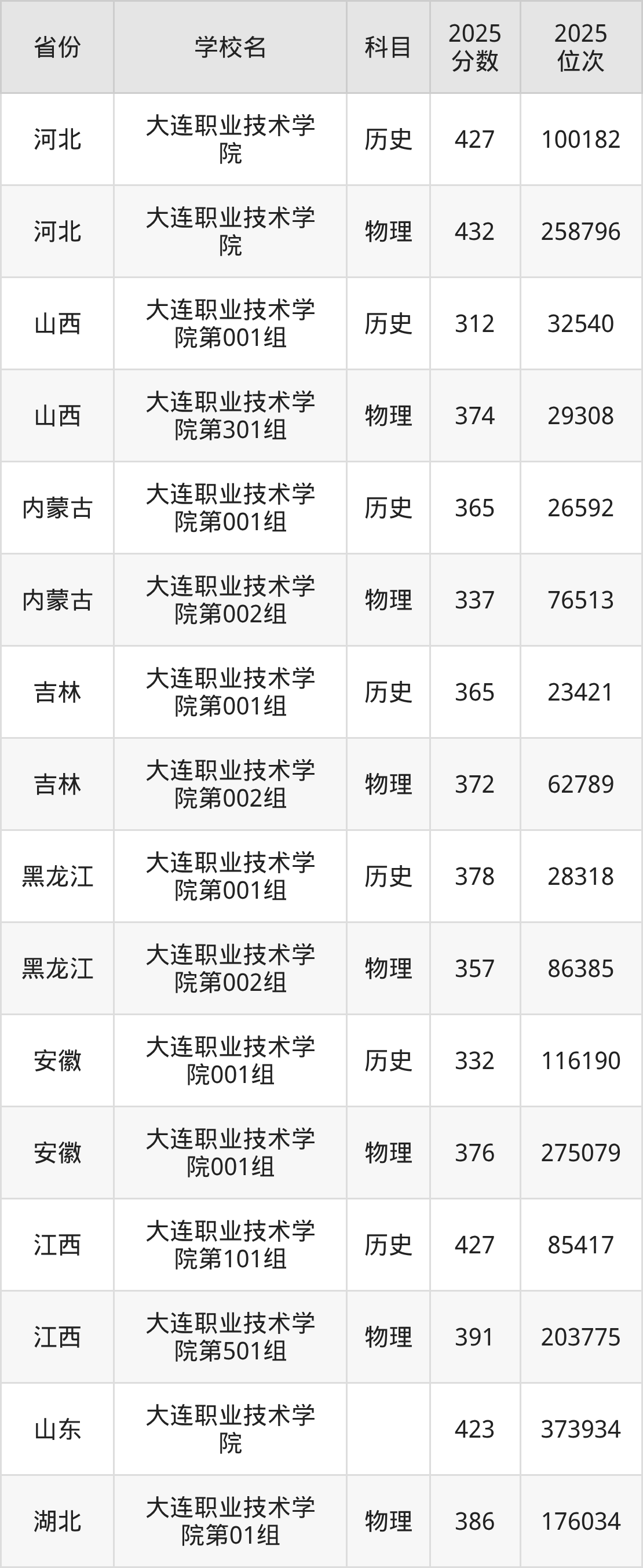 2025年大连职业技术学院历史类最低分328分(47057名)、物理类最低分254分(140742名)。