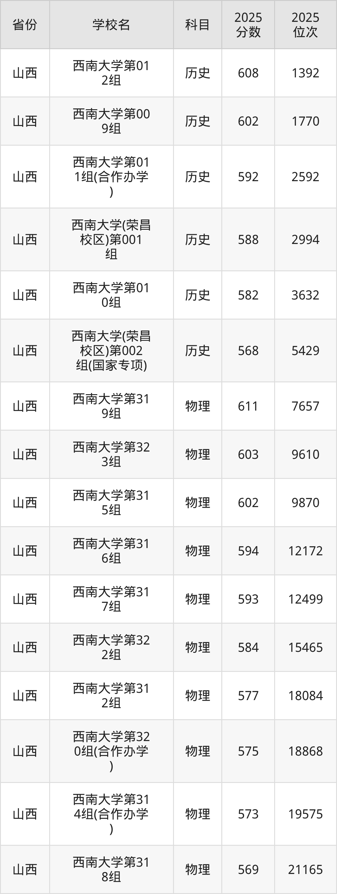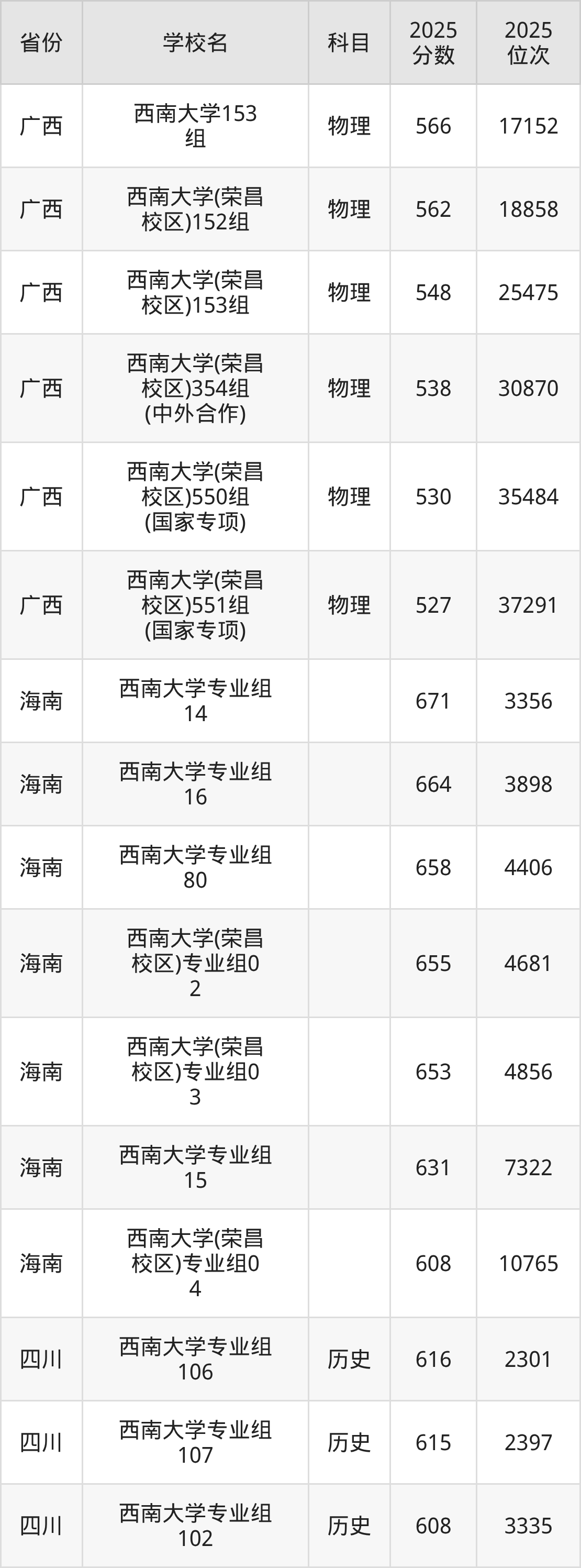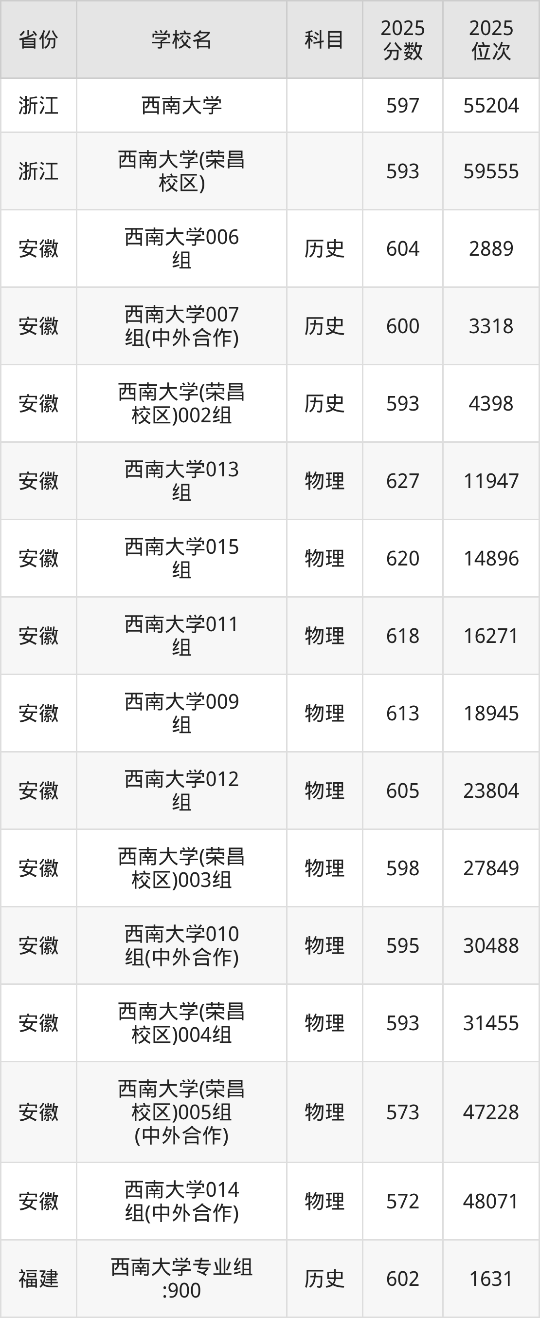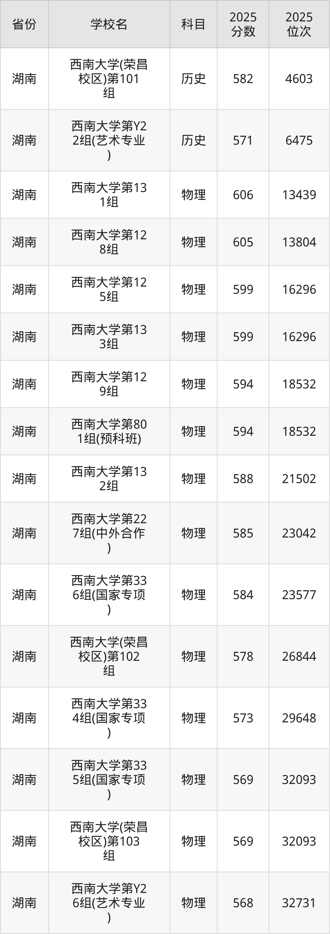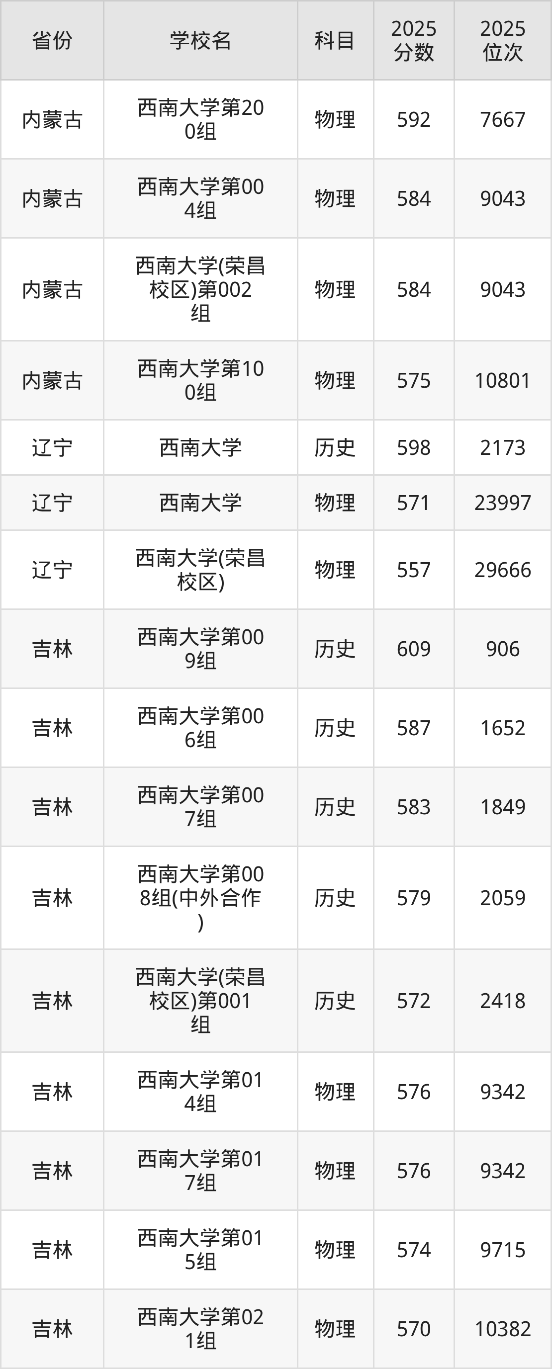 2025年西南大学历史类最低分569分(4375名)、物理类最低分548分(33312名)。