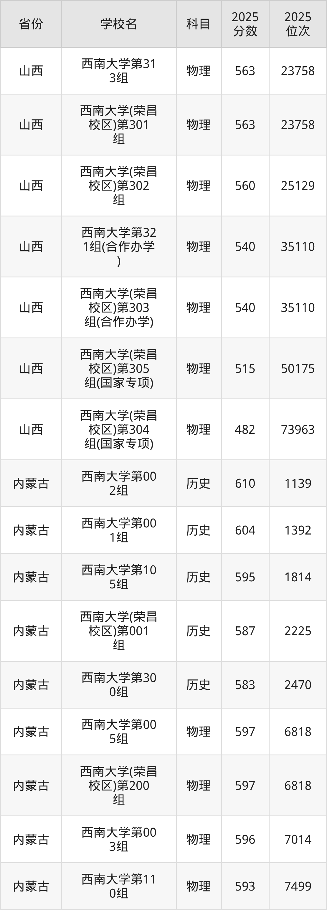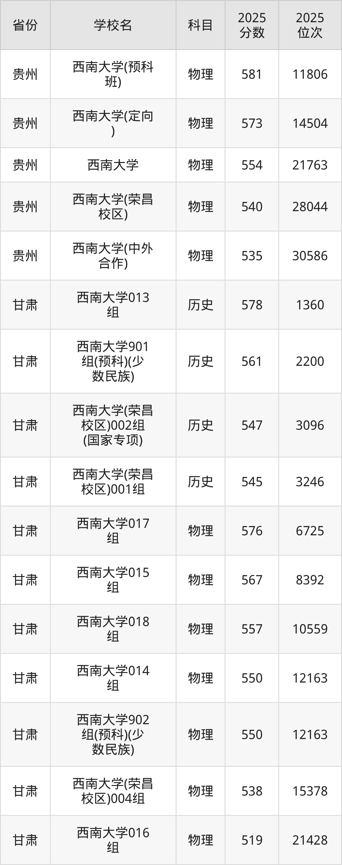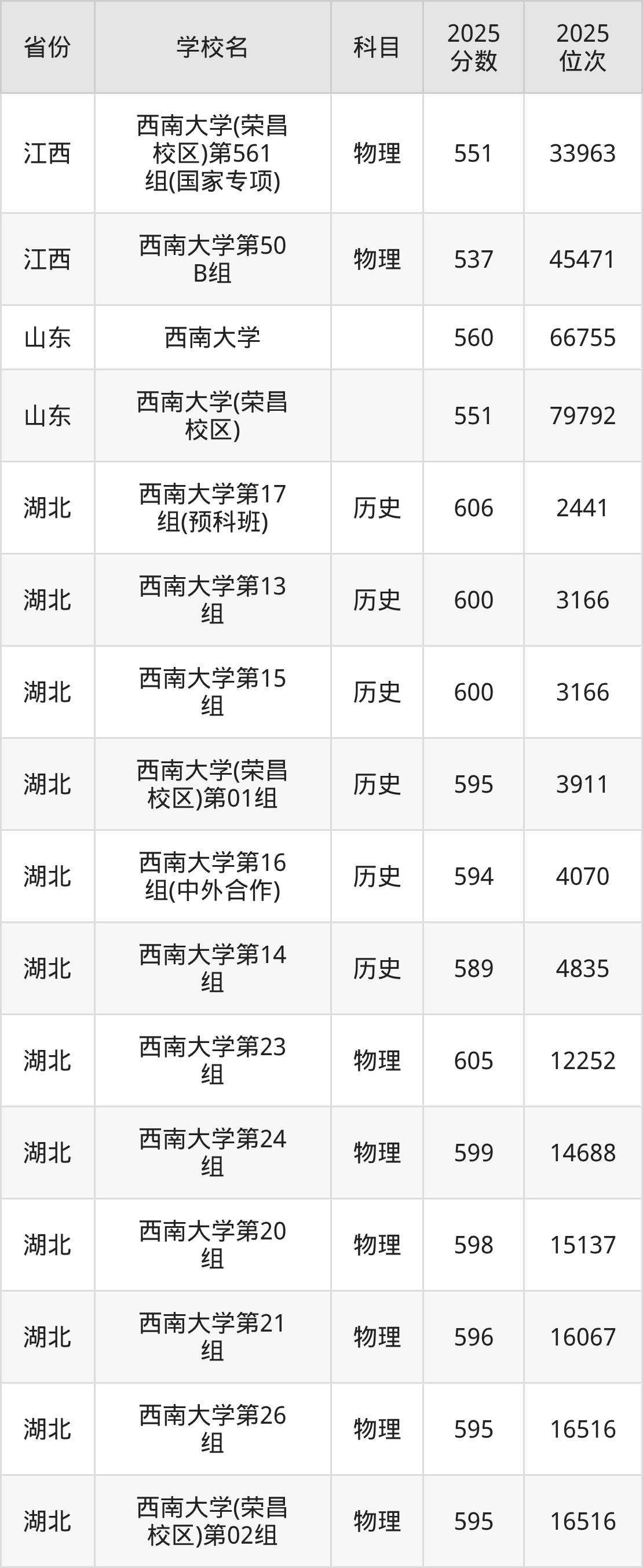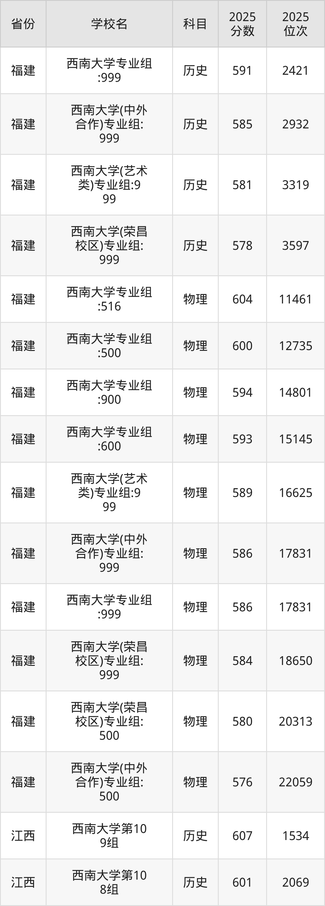 | 西南大学(预科 班) | 历史 | 587 | 2504 |