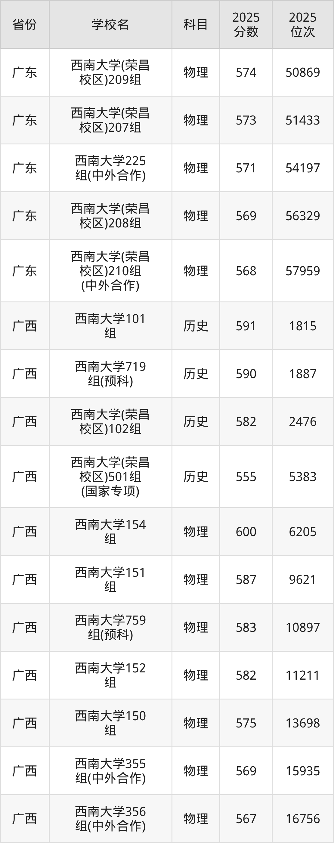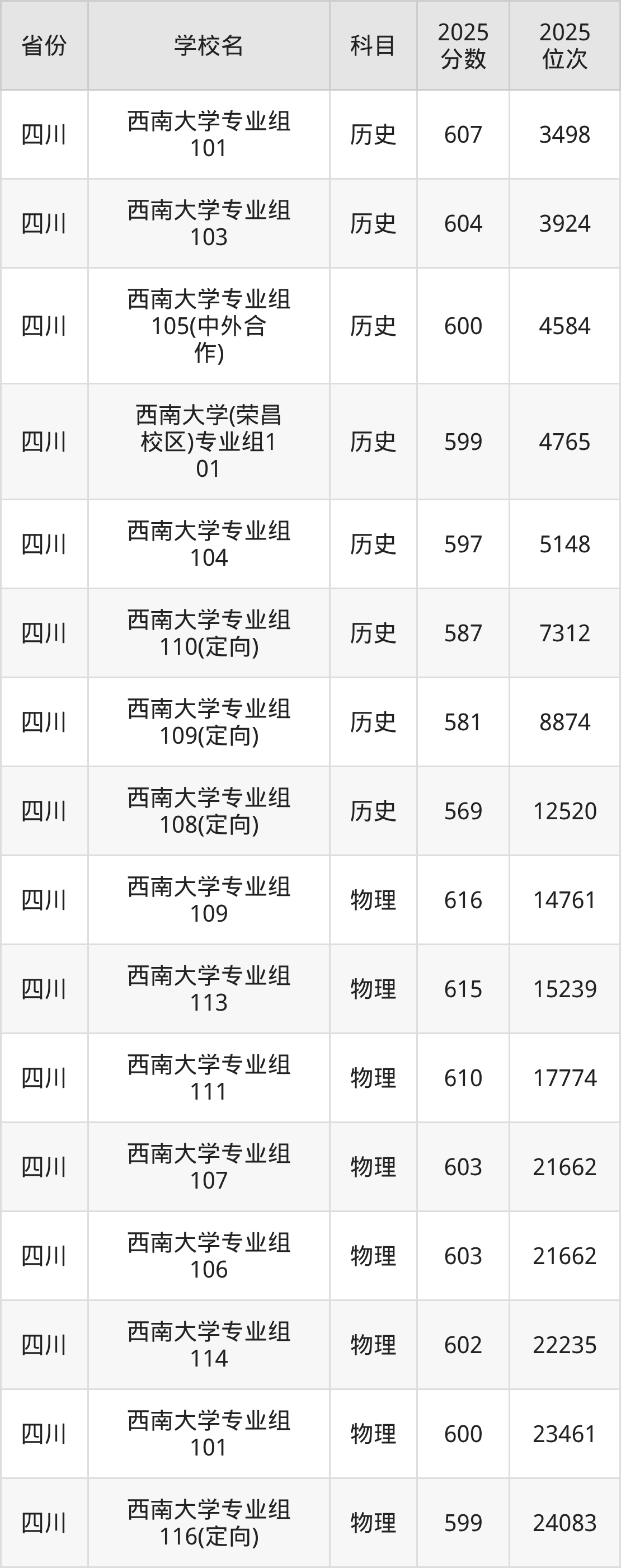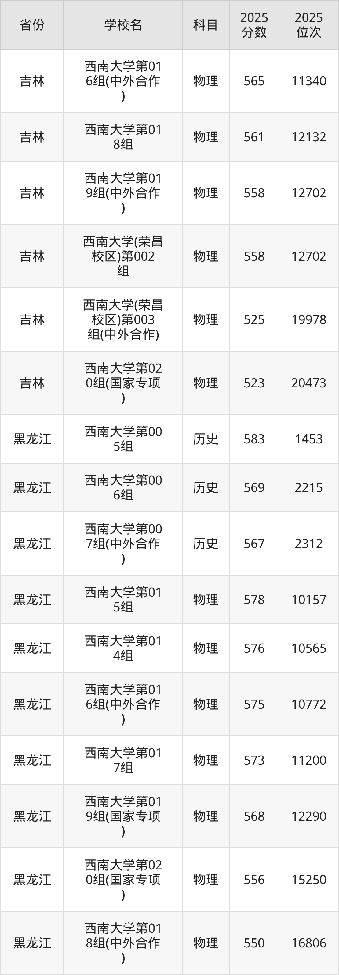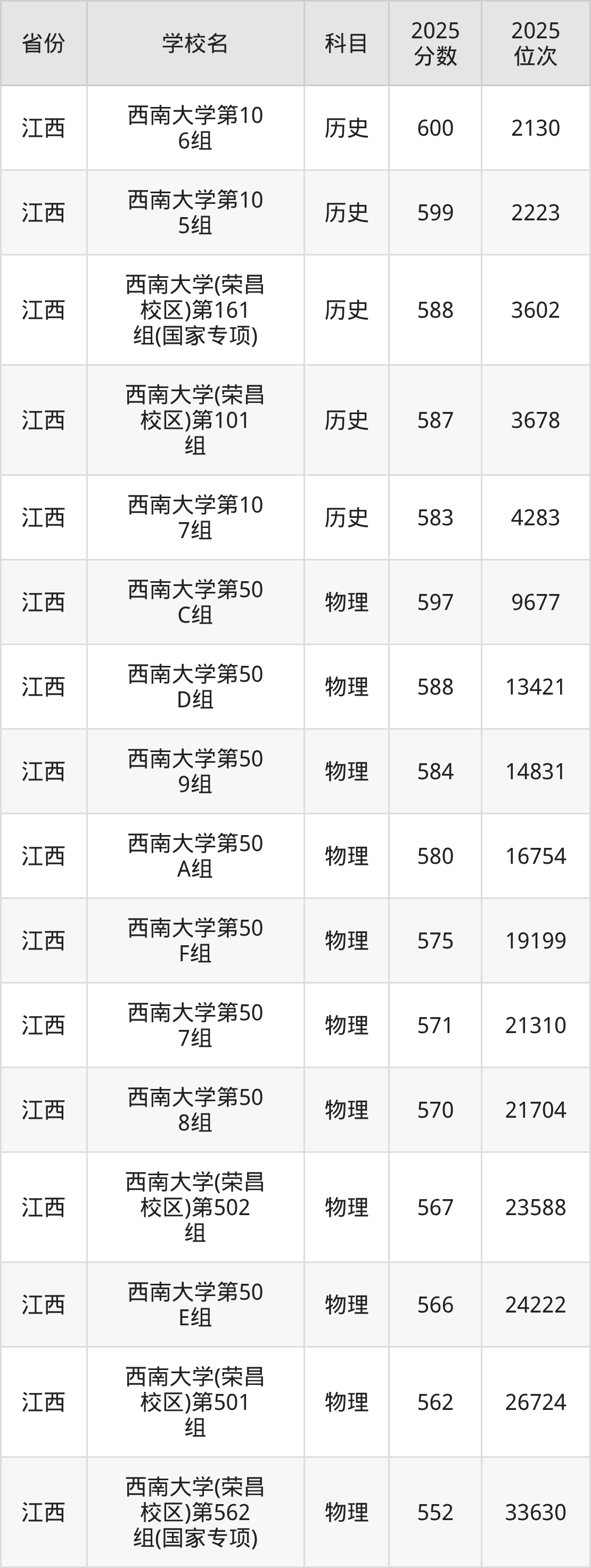 | 西南大学(预科 班) | 历史 | 587 | 2504 |