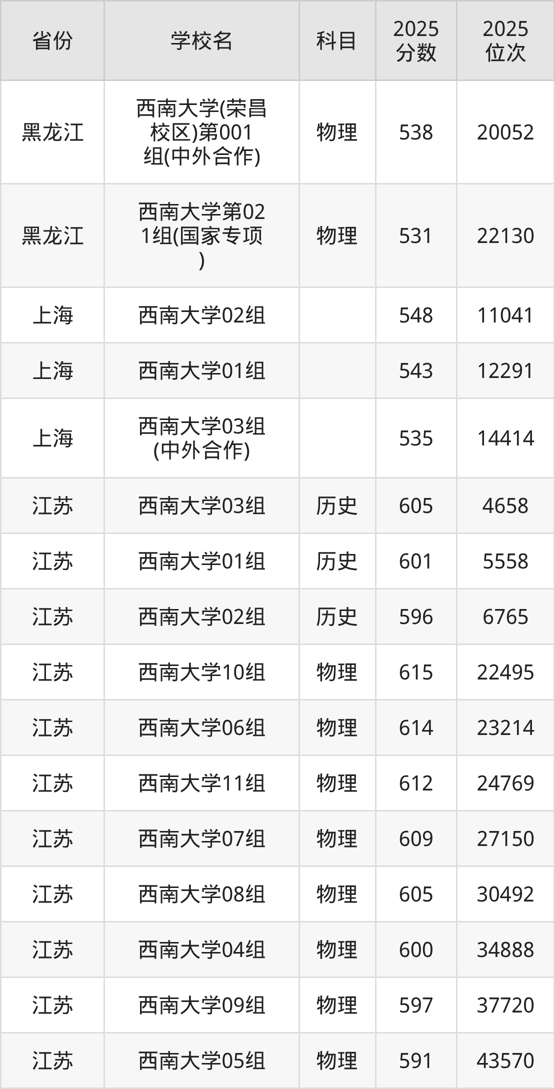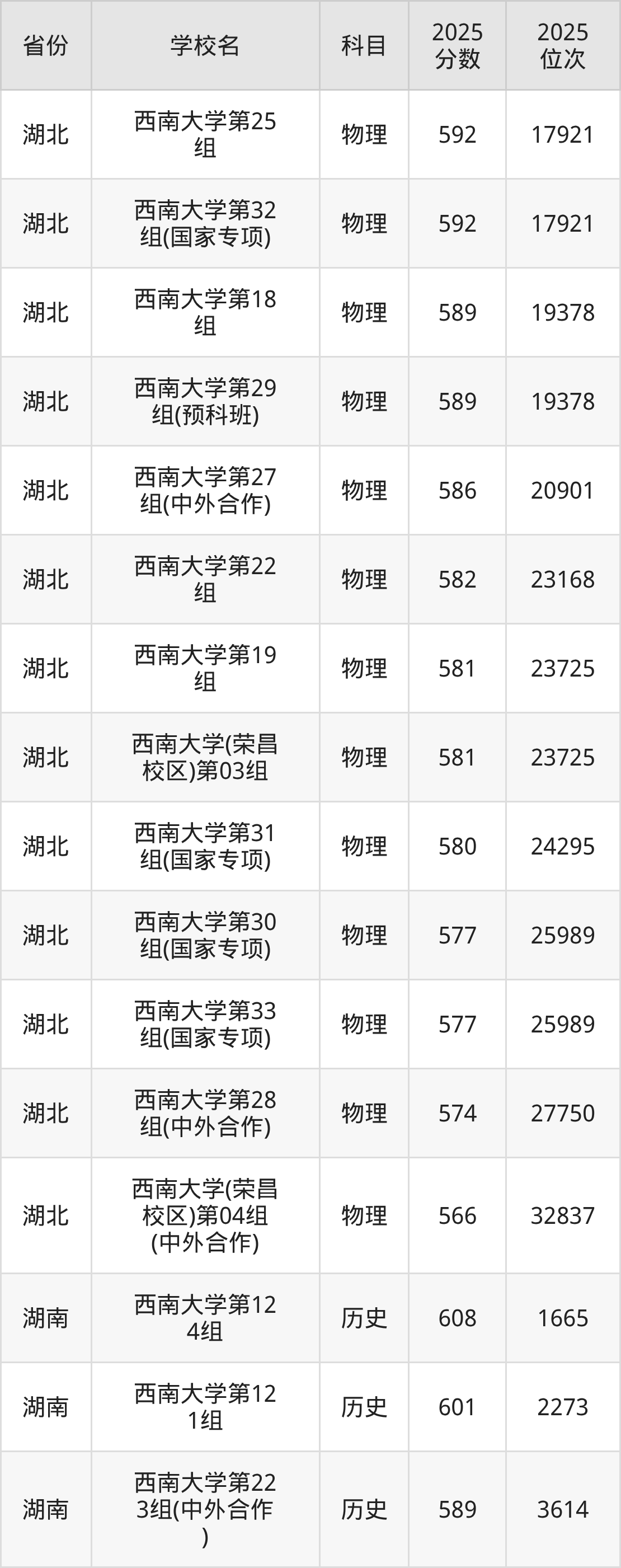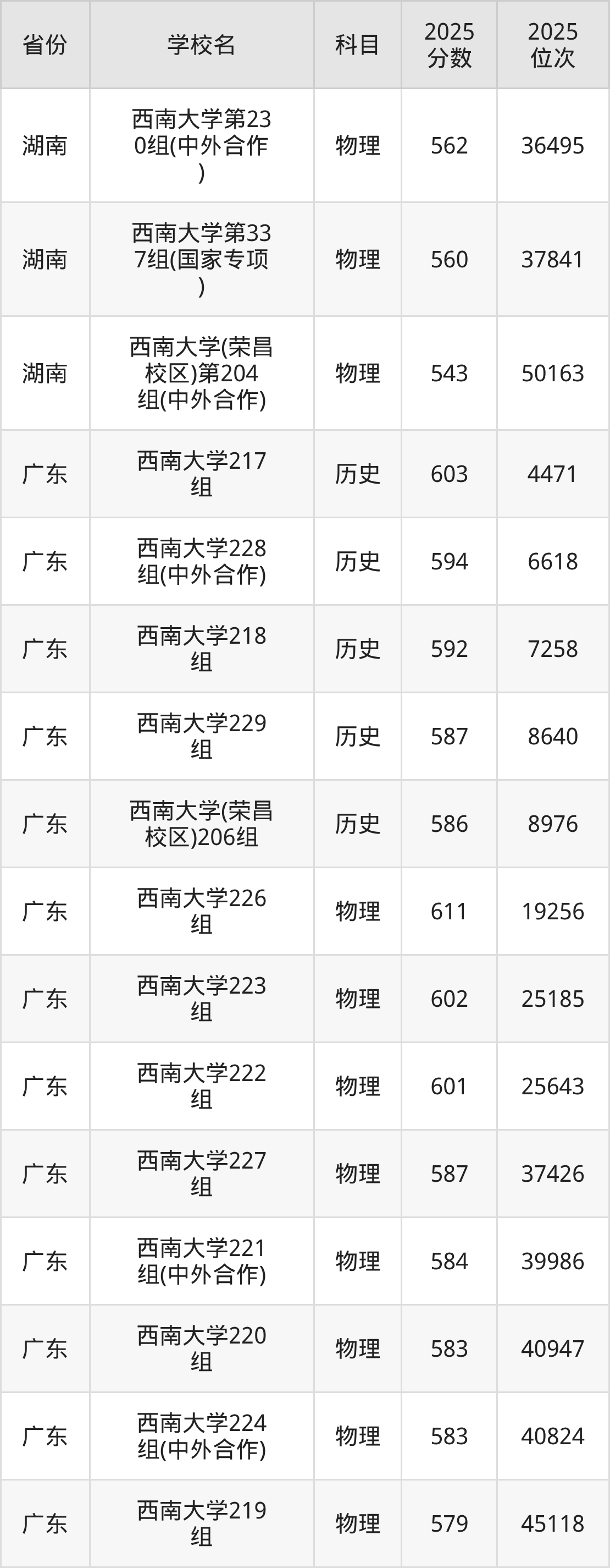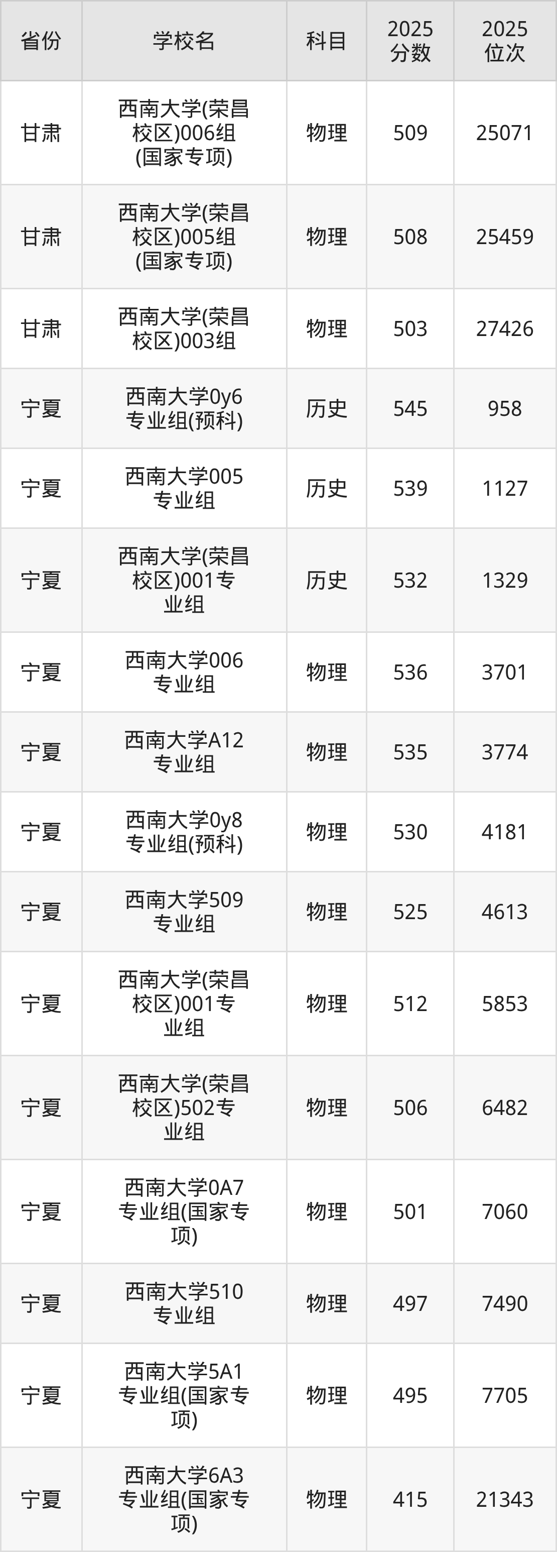 | 西南大学(预科 班) | 历史 | 587 | 2504 |