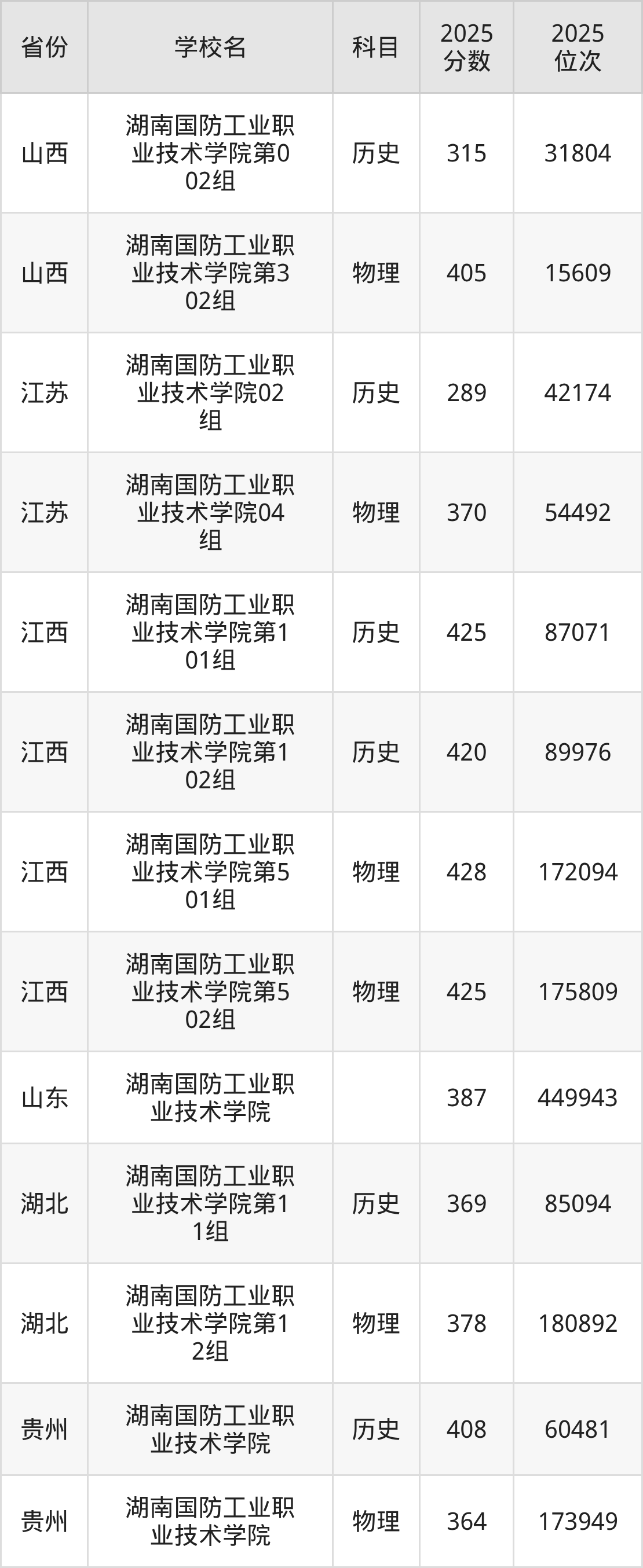 2026年湖南国防工业职业技术学院录取分数线预计在380分及以上,在各省录取最低分存在一定差异,如:2025年湖南国防工业职业技术学院在江苏录取最低历史类289分、物理类370分,在江西录取最低历史类420分、物理类425分,在山东录取最低分是387分。