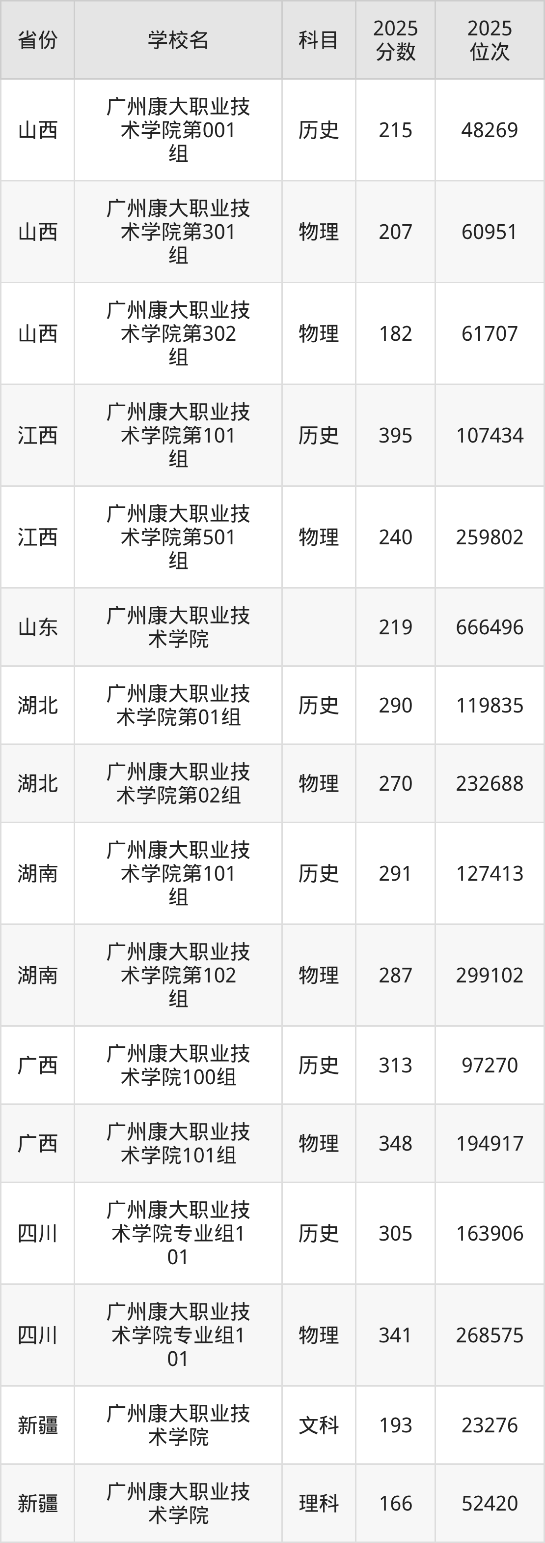 2025年广州康大职业技术学院历史类最低分341分(224842名)、物理类最低分202分(437119名)。