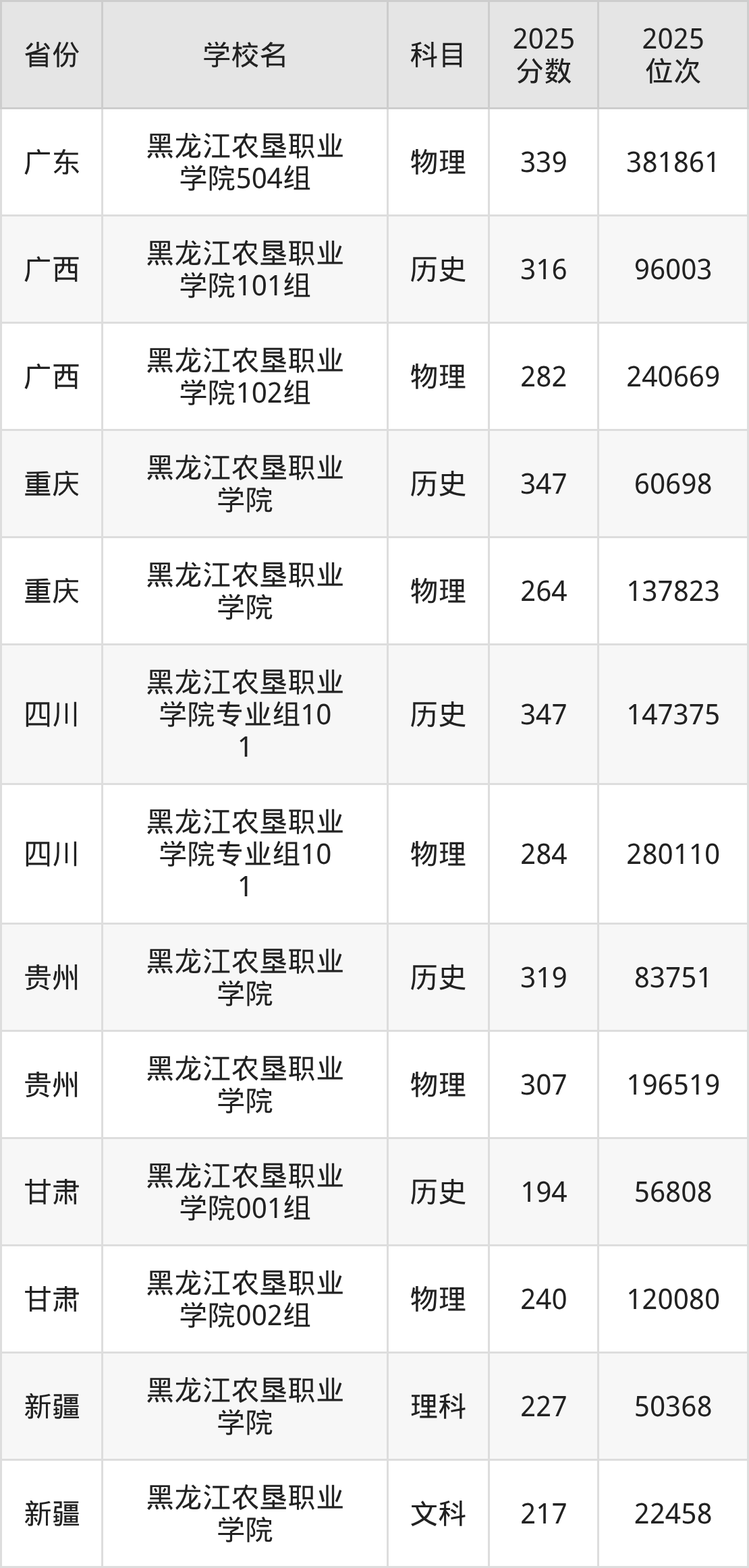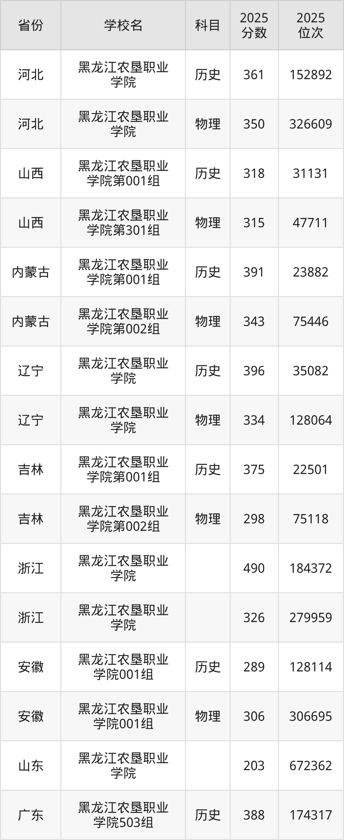 2025年黑龙江农垦职业学院在省内分历史物理科目类录取,其中历史类最低分是320分、对应位次是40253名;物理类最低分是300分,对应位次是103606名。