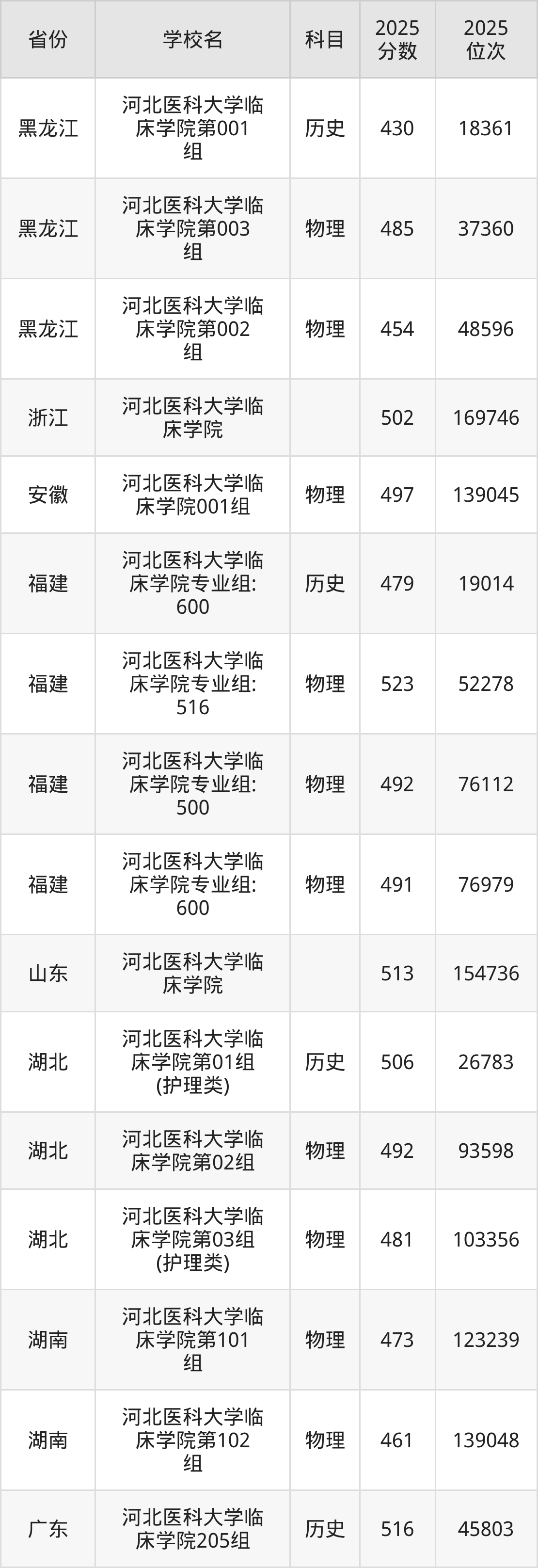 2025年河北医科大学临床学院在省内分历史物理科目类录取,其中历史类最低分是512分、对应位次是42421名;物理类最低分是519分,对应位次是128615名。