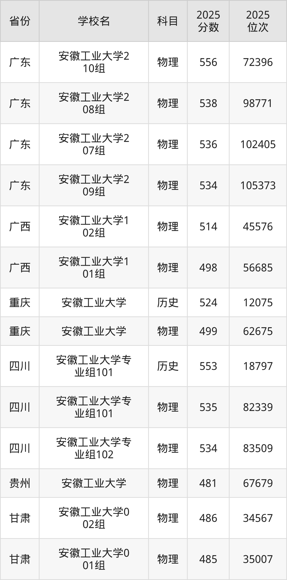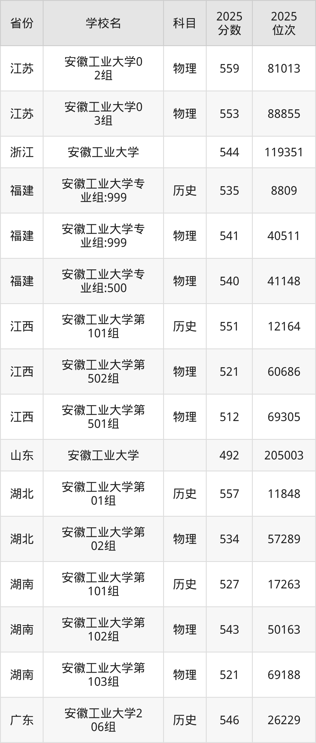 2025年安徽工业大学在省内分历史物理科目类录取,其中历史类最低分是543分、对应位次是16100名;物理类最低分是542分,对应位次是79489名。