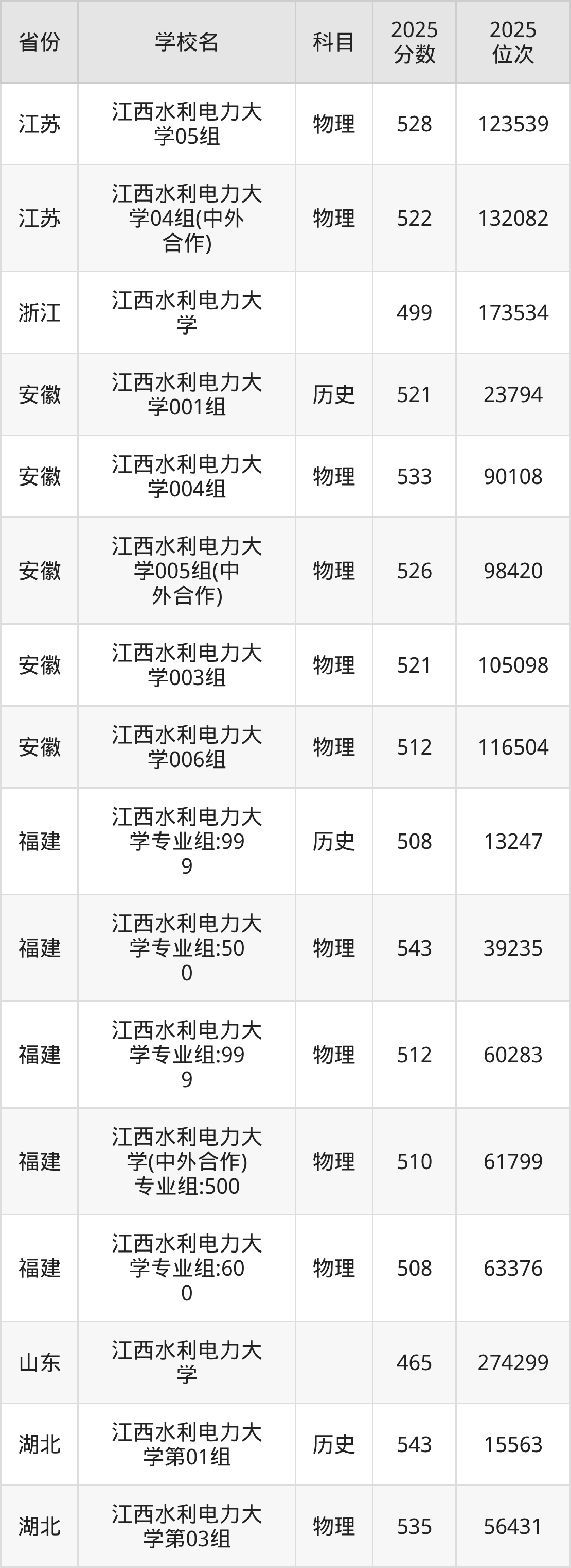 2025年江西水利电力大学在省内分历史物理科目类录取,其中历史类最低分是534分、对应位次是18667名;物理类最低分是501分,对应位次是81975名。