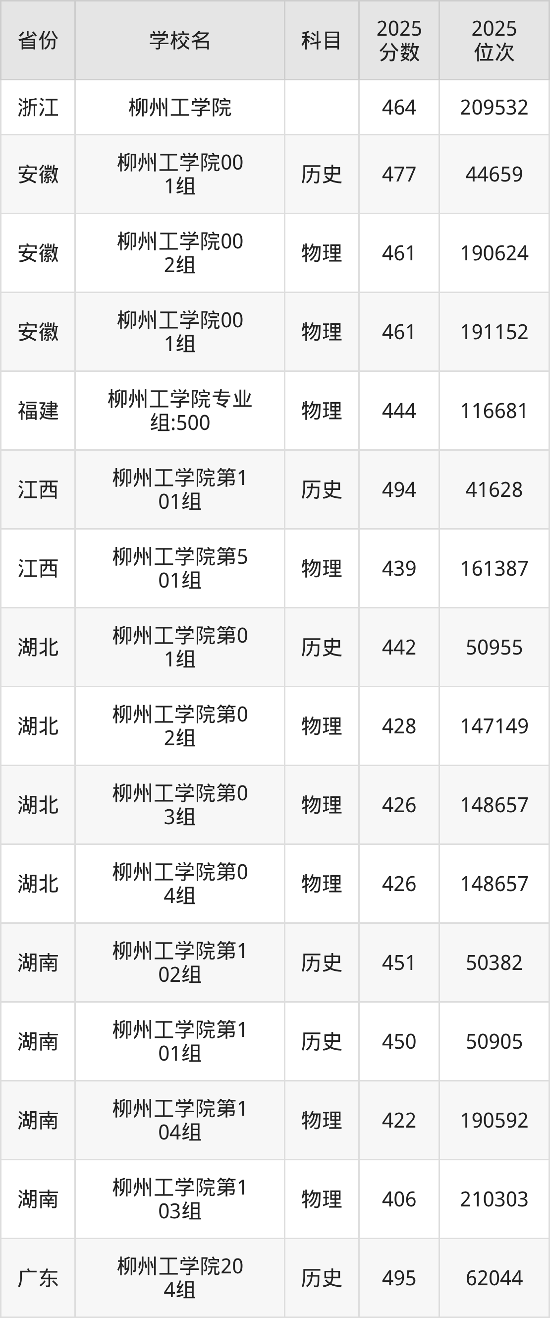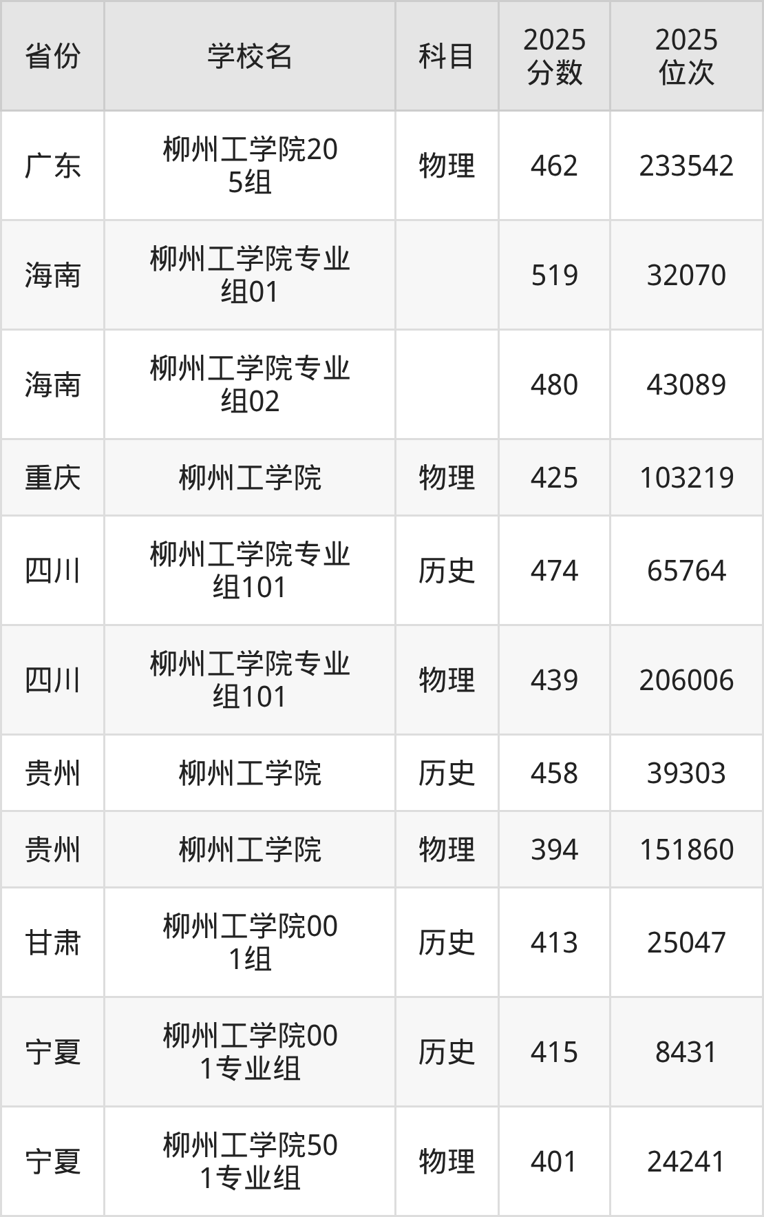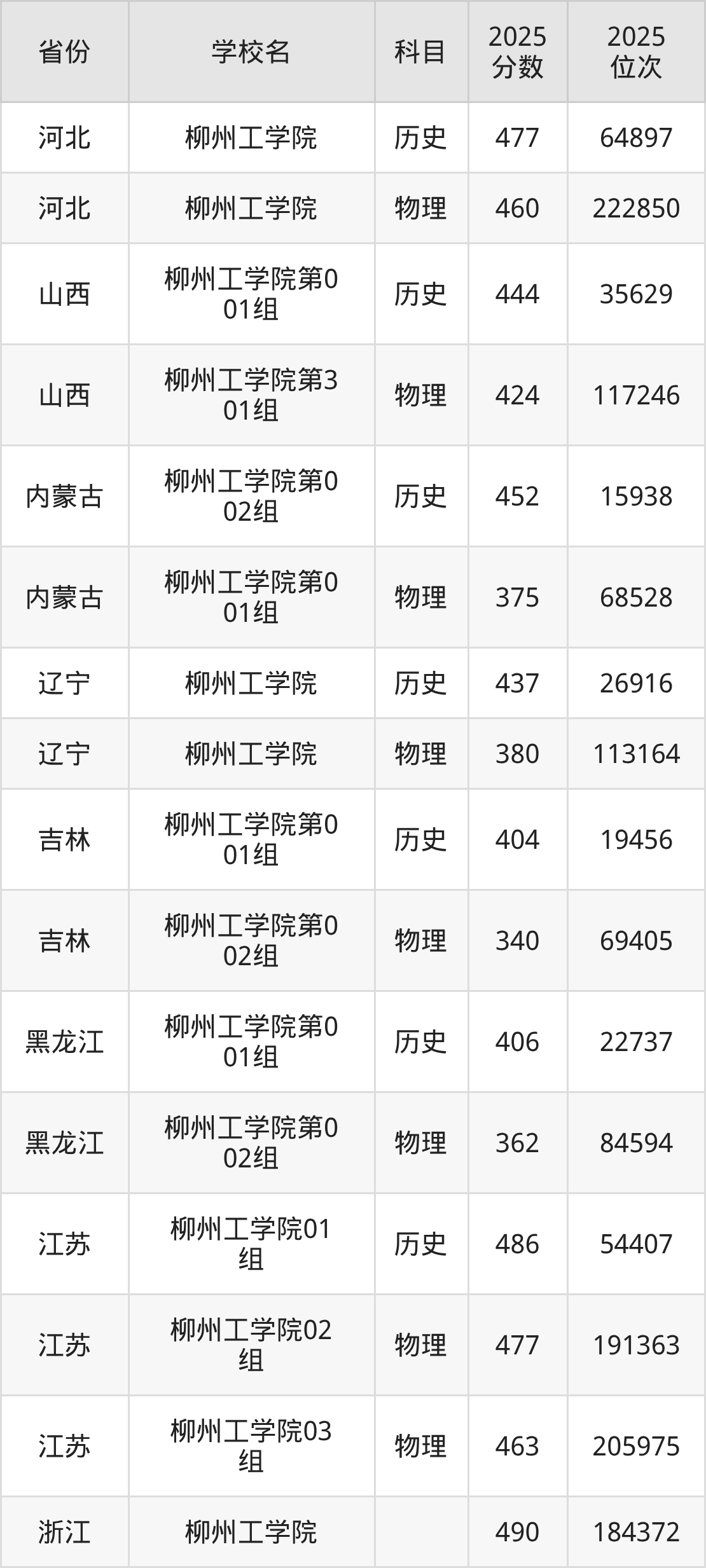 2025年柳州工学院历史类最低分402分(53085名)、物理类最低分370分(174425名)。