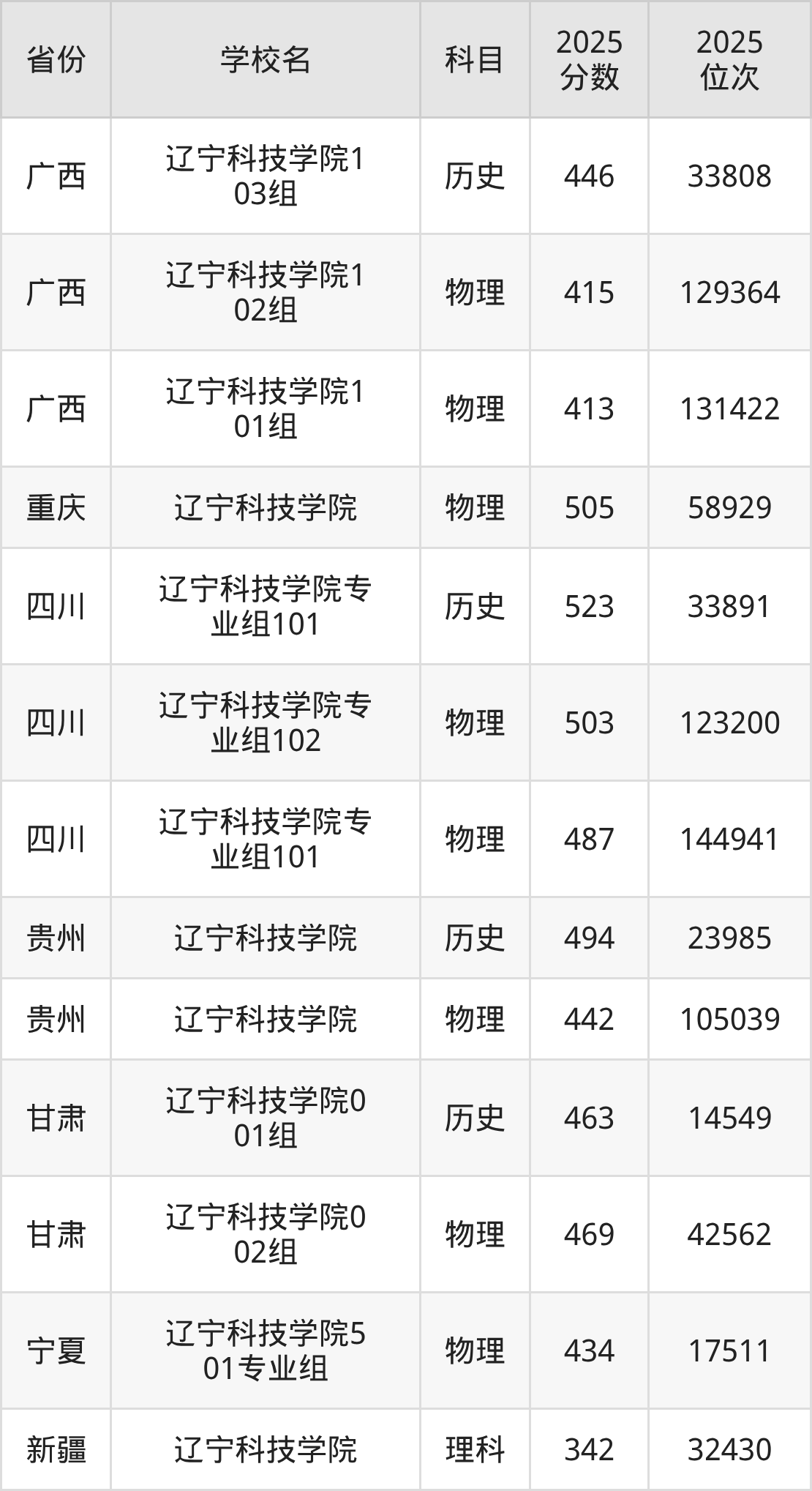 2025年辽宁科技学院在省外录取分数线范围整体位于342分到523分之间,录取分数线最低在新疆理科、录取分数线最高在四川历史(专业组101)。