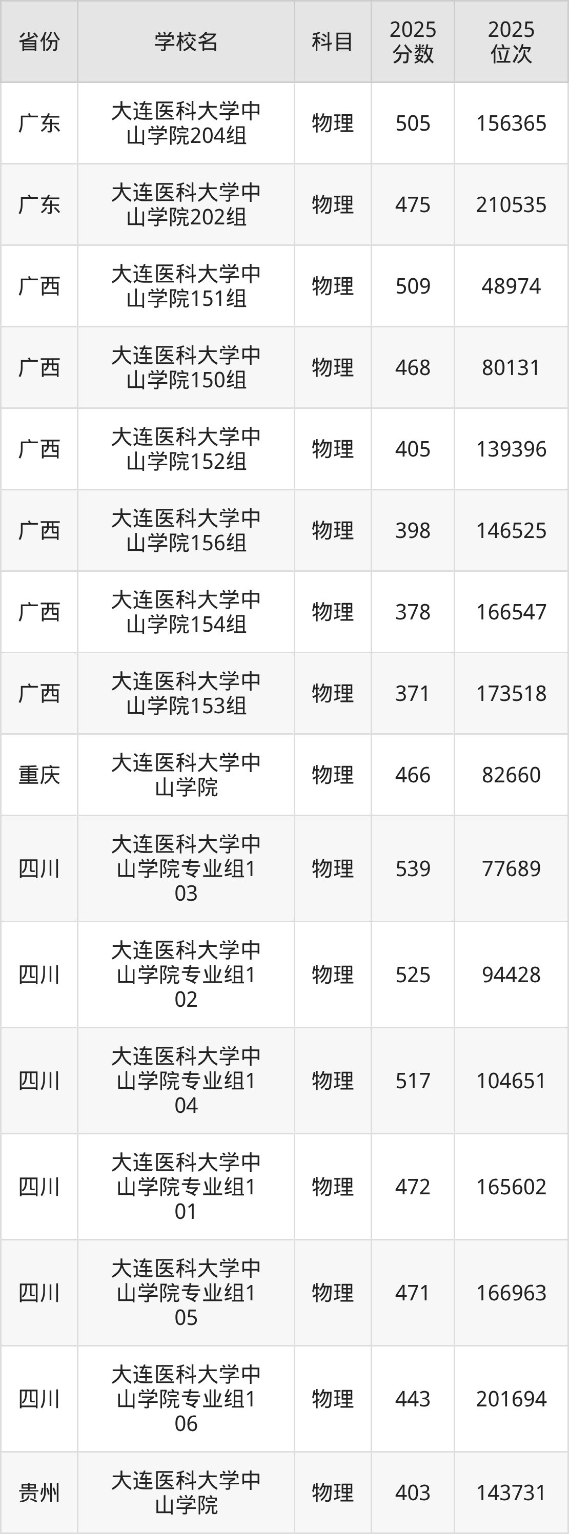 | 大连医科大学中 山学院 | 物理 | 422 | 95268 |