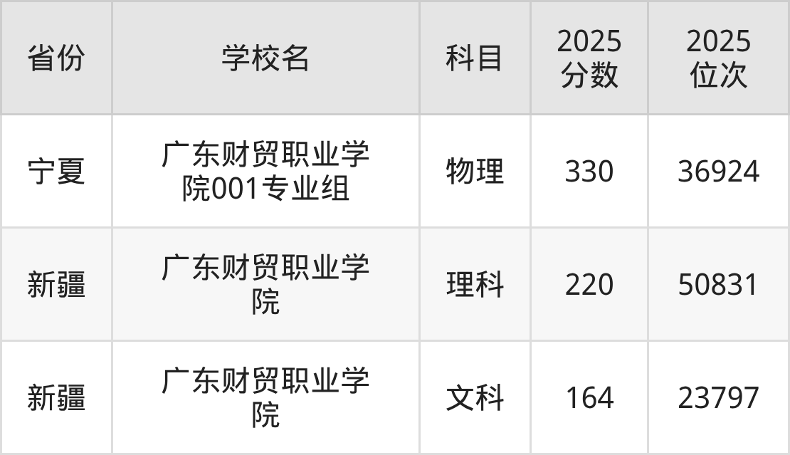 2025年广东财贸职业学院在省外录取分数线范围整体位于164分到475分之间,录取分数线最低在新疆文科、录取分数线最高在江西历史(第102组)。