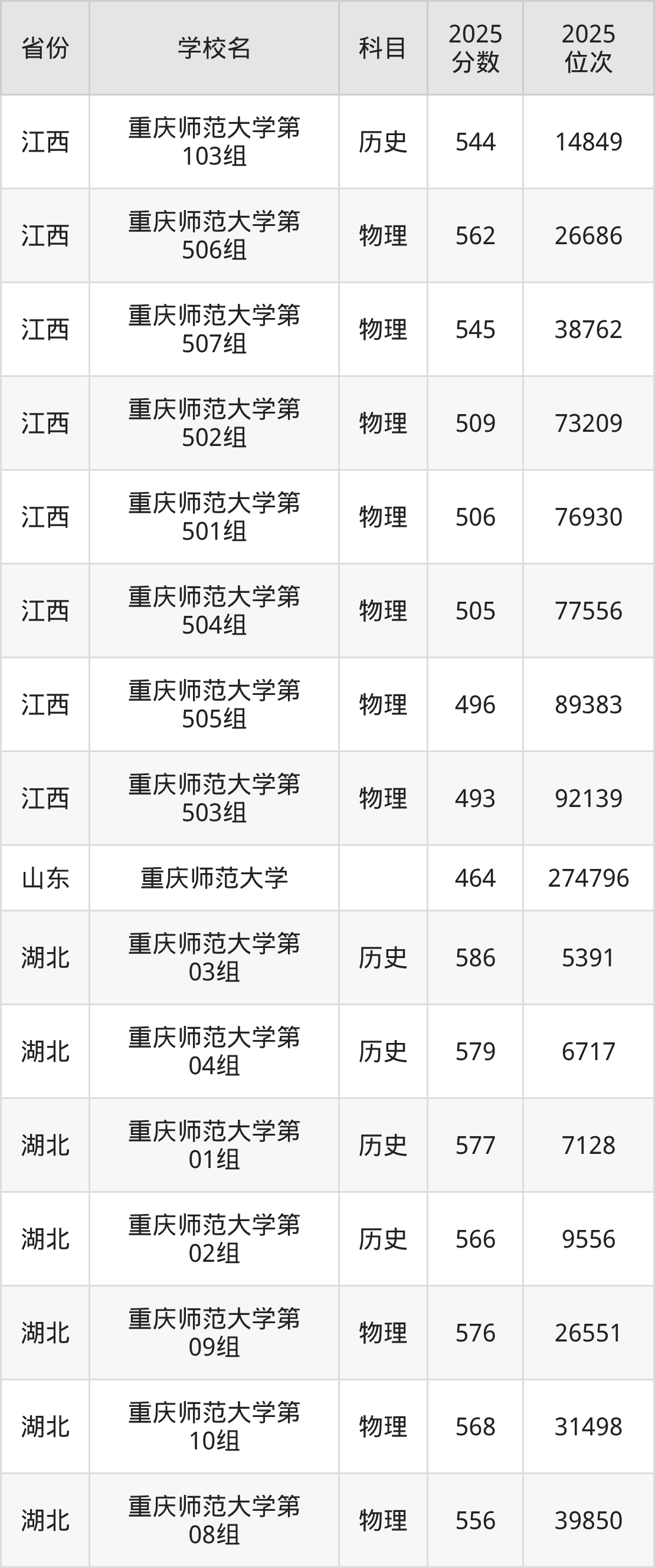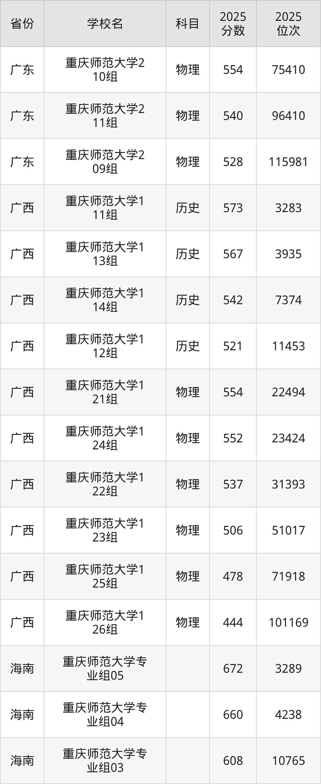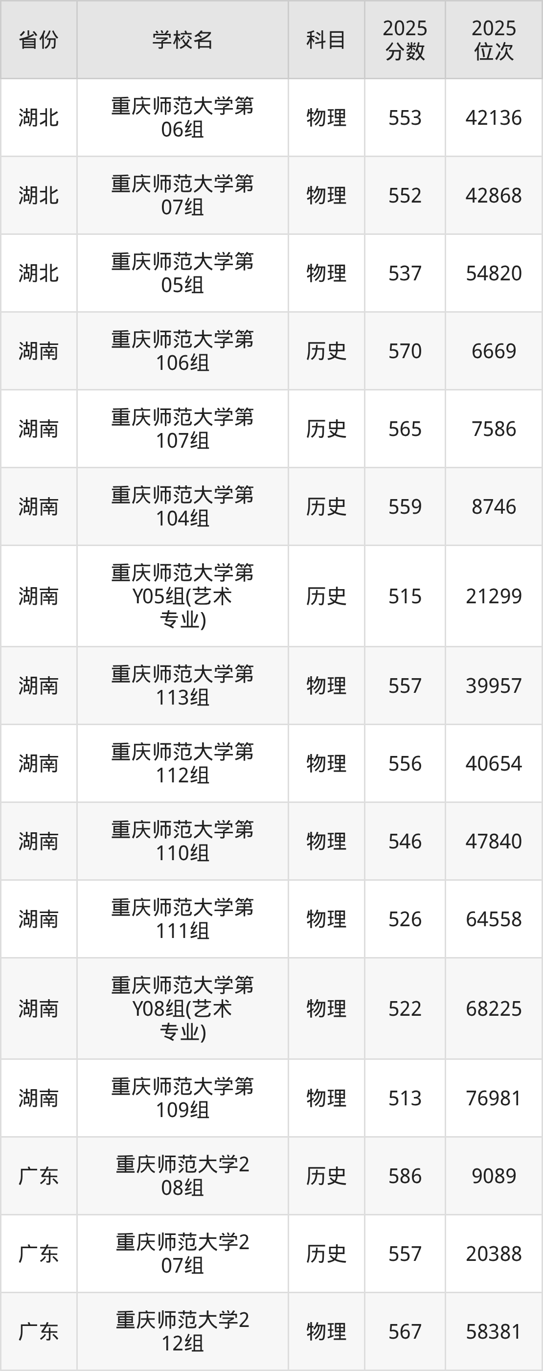 2025年重庆师范大学在市内分历史物理科目类录取,其中历史类最低分是508分、对应位次是15814名;物理类最低分是516分,对应位次是51989名。