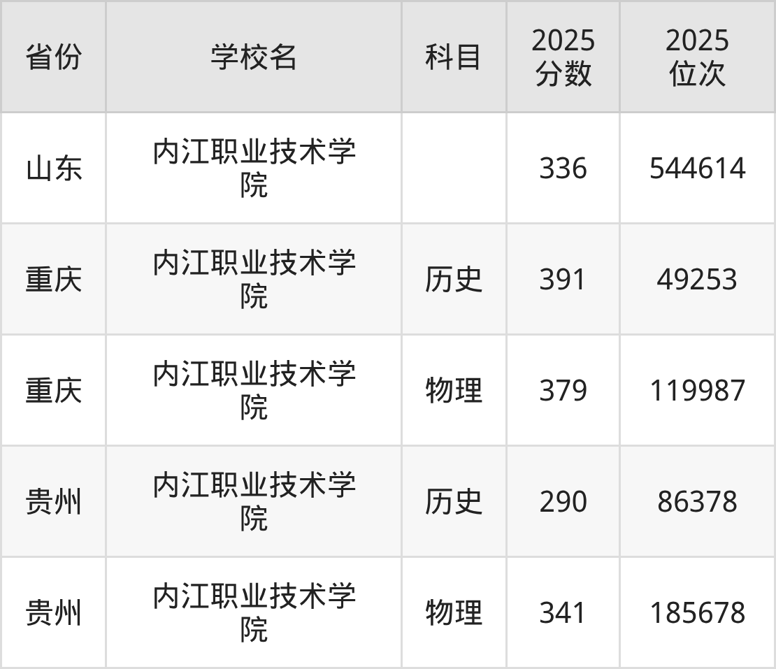 2026年内江职业技术学院录取分数线预计在340分及以上,在各省录取最低分存在一定差异,如:2025年内江职业技术学院在重庆录取最低历史类391分、物理类379分,在四川录取最低历史类407分、物理类297分,在贵州录取最低历史类290分、物理类341分。